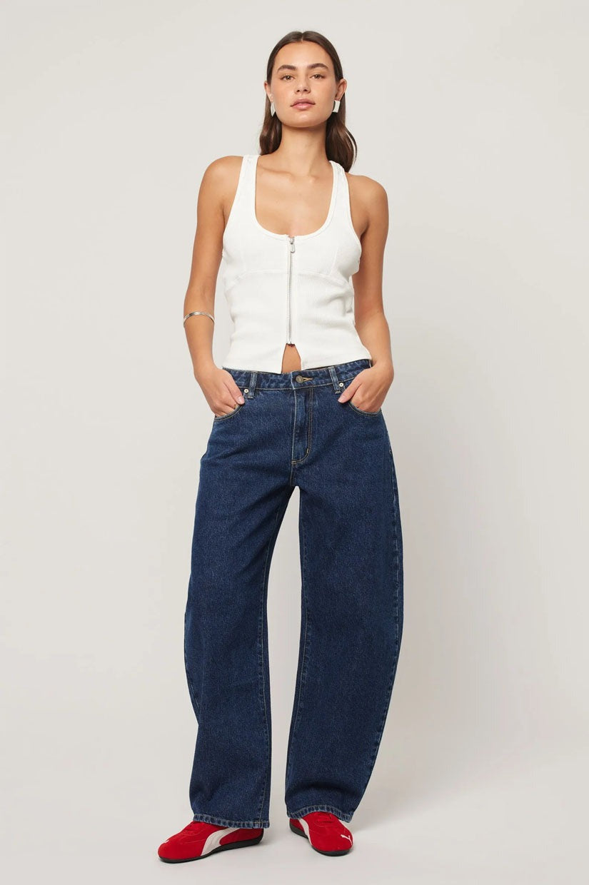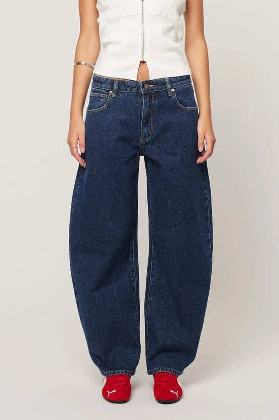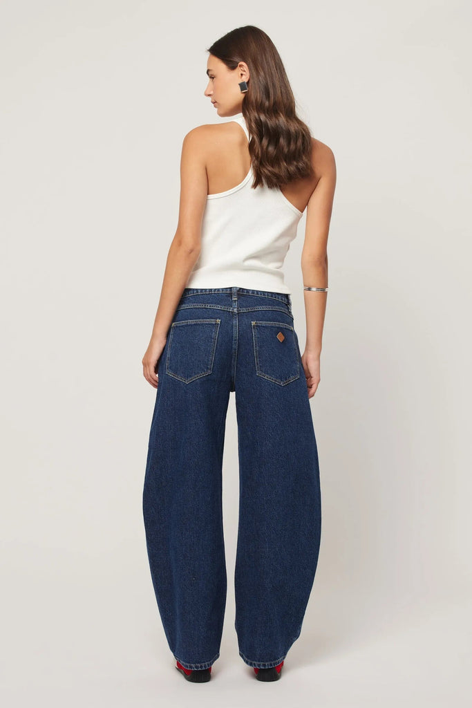 The 95 Mid Barrel Jean in Tara has a mid rise, relaxed seat and bowed leg shape- finishing just below the ankle.