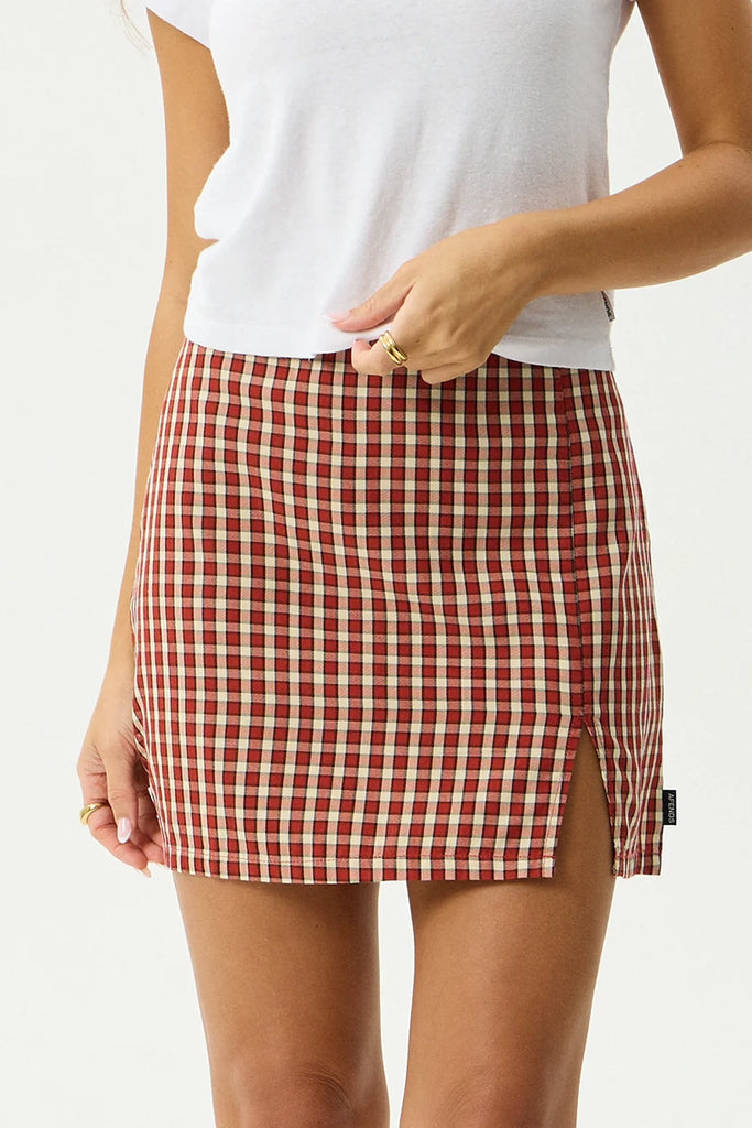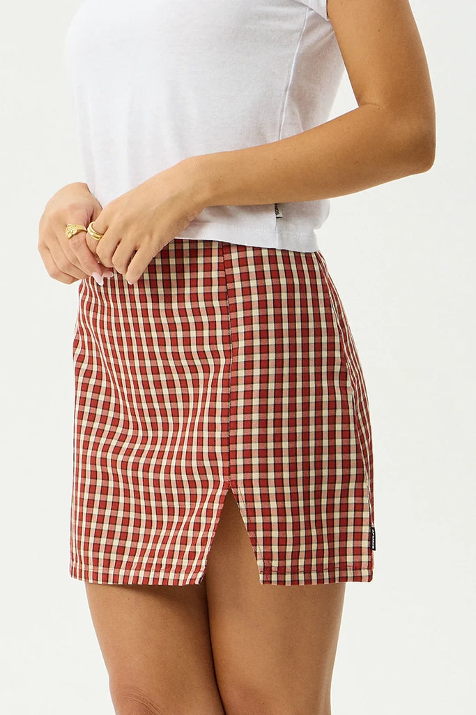 Introducing the 'Austin' collection in Red Rum, Afends latest custom yarn dyed woven check in a rich red tonal palette. This mini skirt is designed with a high waist, subtle thigh split and invisible side zip.