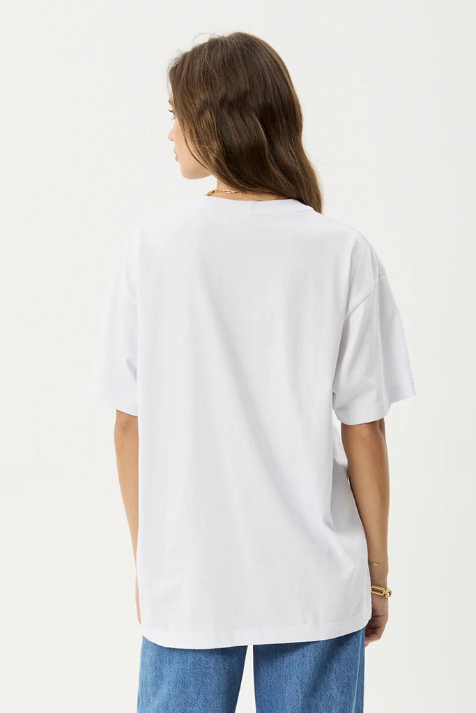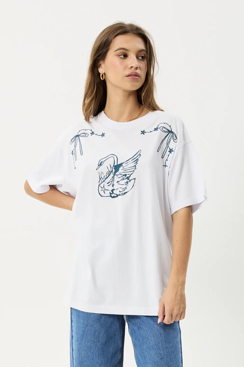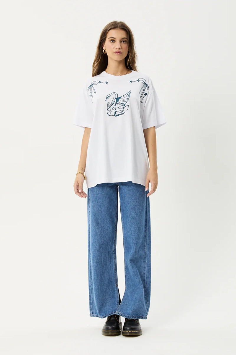 The 'Cygnet' oversized tee is cut in a baggy fit for a laid back look, made from a recycled cotton blend jersey, finished with a ribbed crew neckline and embroidered graphic at the front.