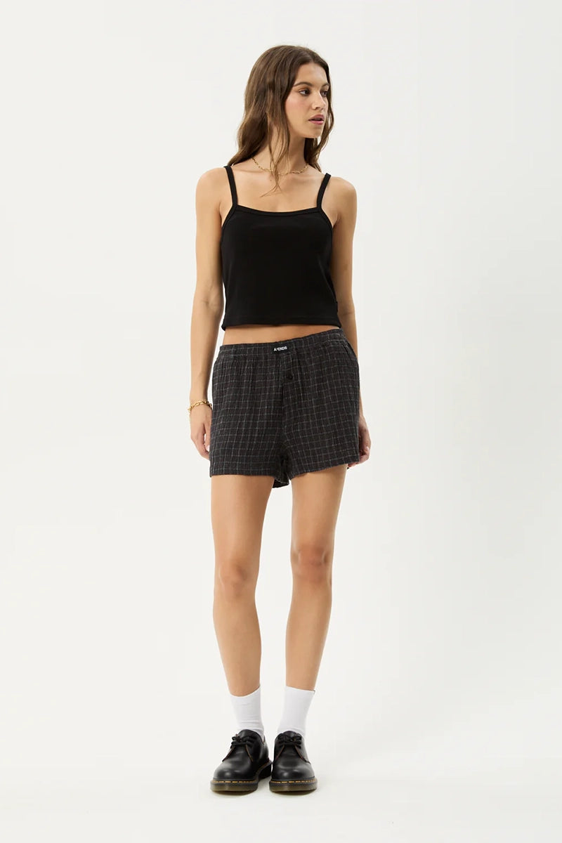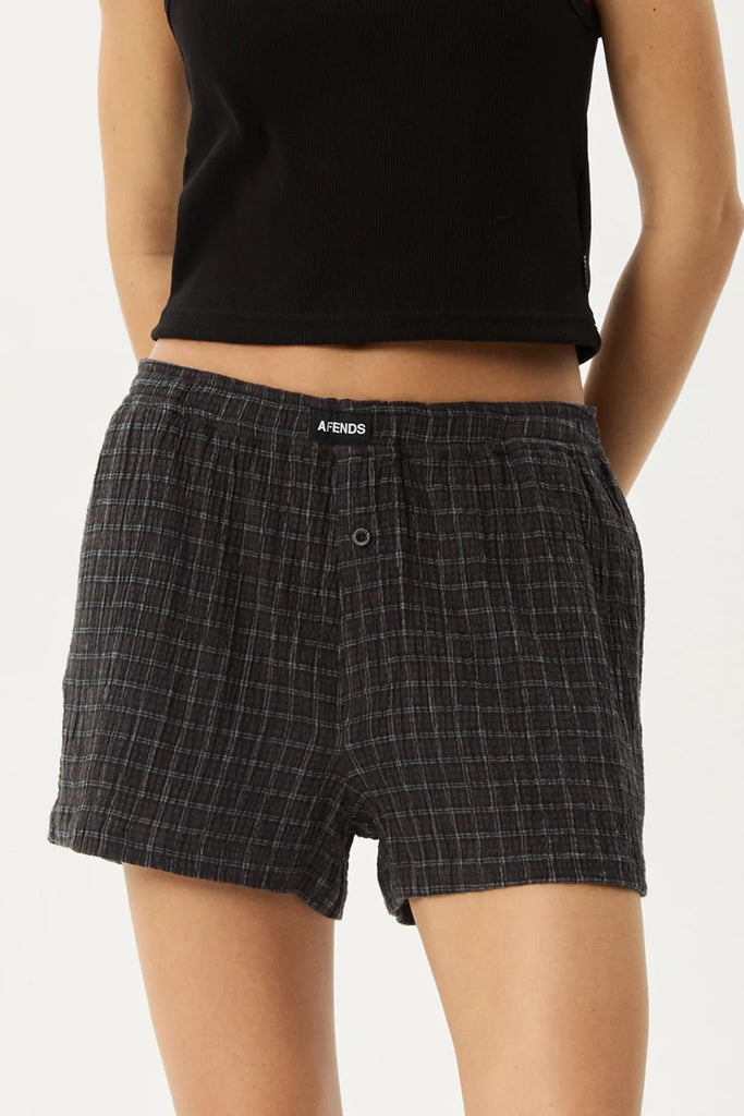 The 'Dusk' collection in black check is made from a lightweight hemp and tencel seersucker with a custom yarn dyed woven check. This boxer short is designed with a relaxed fit and elasticated waist for comfort. It includes self fabric side seam pockets, patch label and button detail.