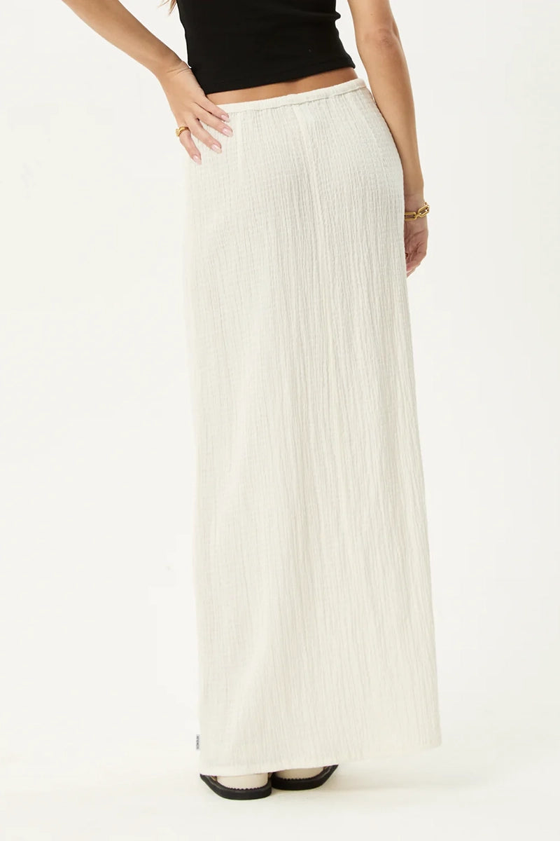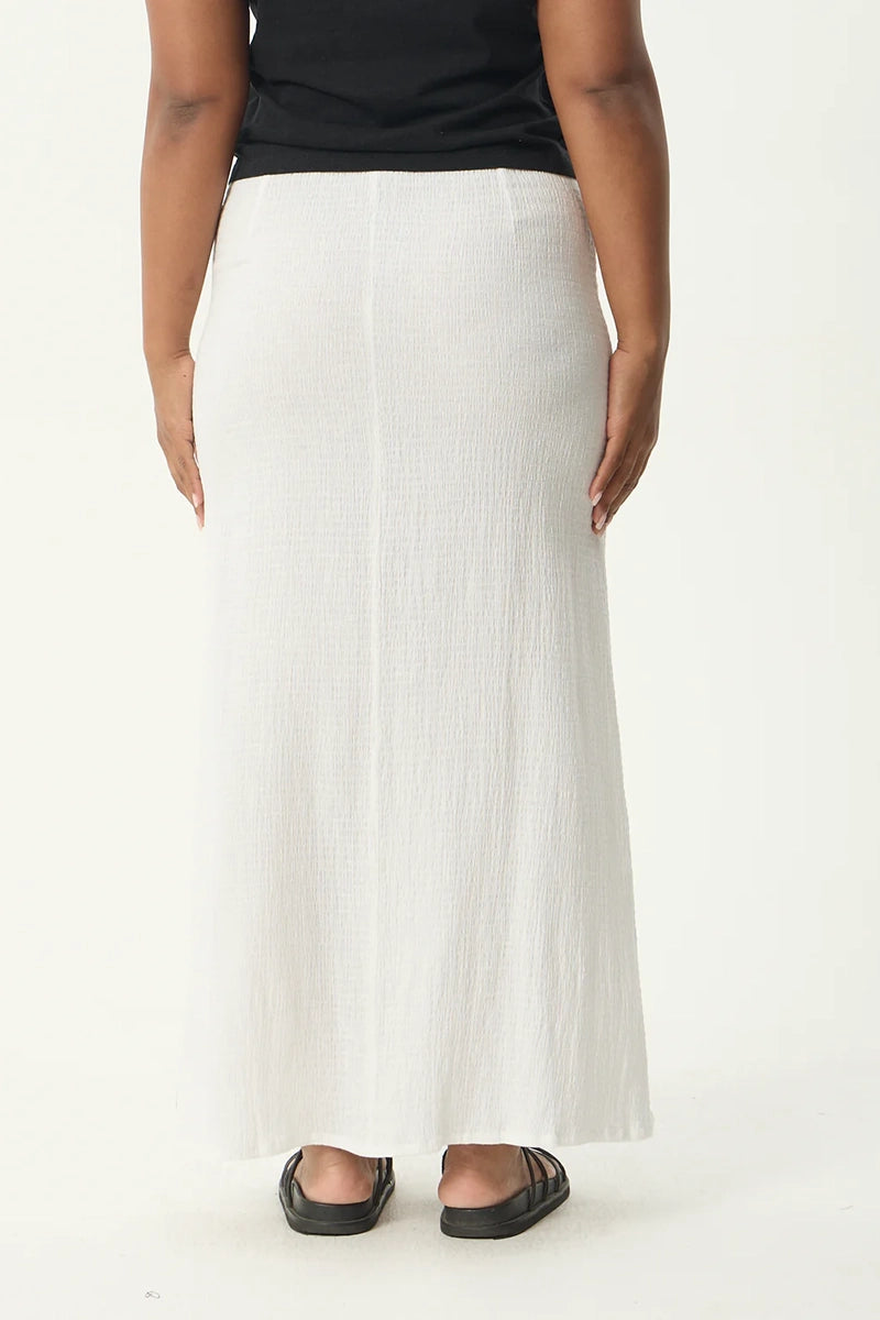 Crafted in our signature hemp and tencel seersucker blend, this off white maxi skirt is lightweight, breathable and textured for subtle dimension. The elastic waistband with drawcord offers an adjustable fit, while the flowing silhouette makes it drape effortlessly for a clean, relaxed silhouette.