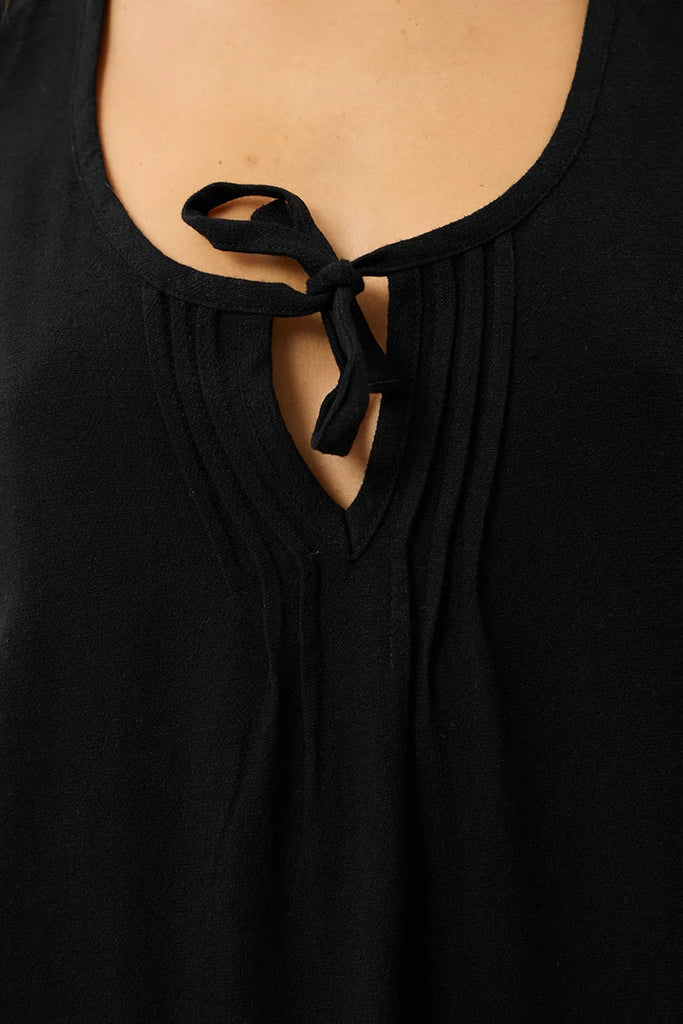 Introducing the 'Michi' mini dress, crafted from a breathable midweight linen blend fabric with a crepe texture. Designed with a boxy fit, keyhole tie front, pin tucks and bust darts for subtle shaping.
