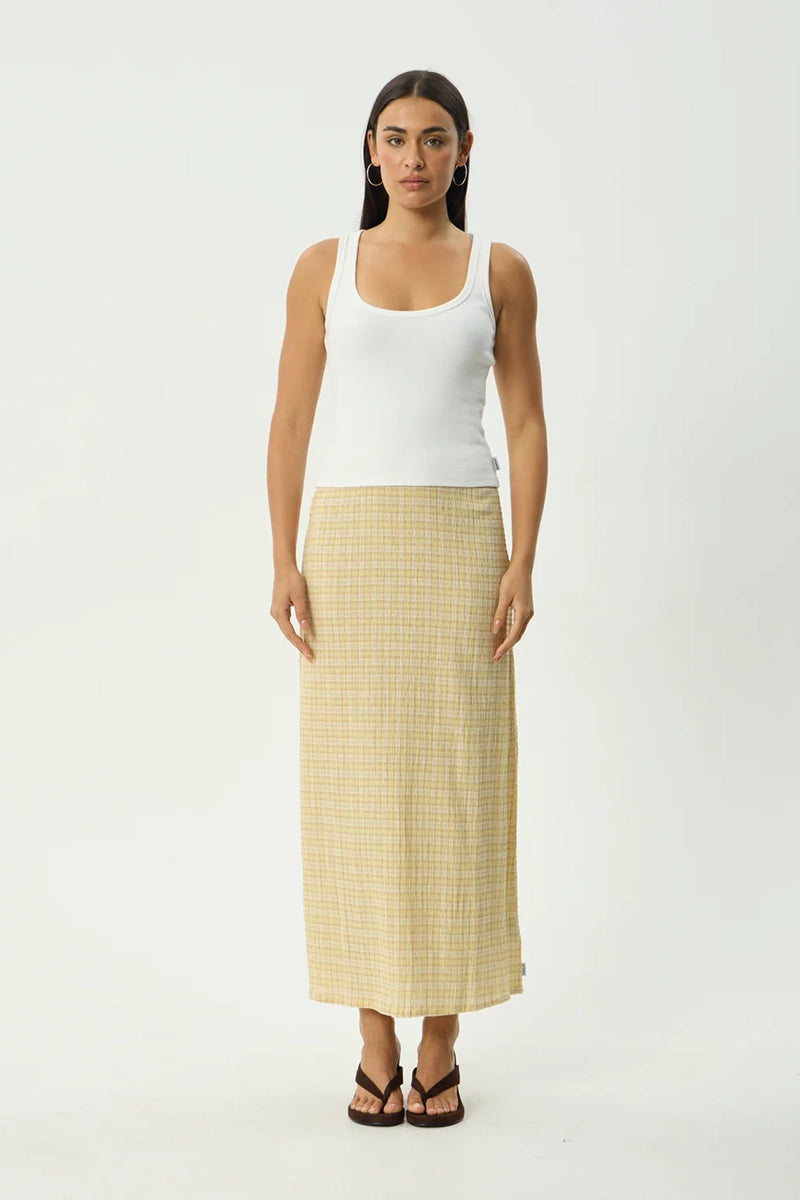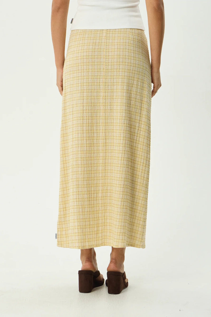 Afends signature lightweight, breathable hemp tencel seersucker returns in the newest lemon check as part of our ongoing collection of refined shapes. This maxi skirt is designed with an a-line skimming fit, mid-high rise waist and invisible side zip for a seamless finish.