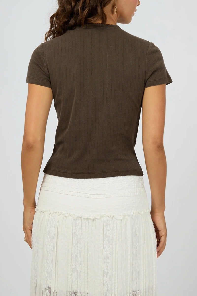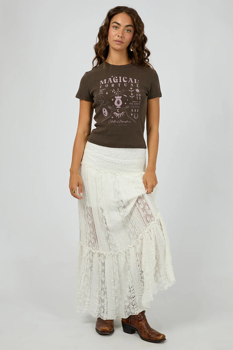 Whimsical and earthy, the Fortune Baby Tee features a blush pink boho graphic on soft brown cotton pointelle for a vintage-meets-dreamy feel. With its baby tee fit and delicate texture, it pairs perfectly with a denim mini skirt or a flowing maxi skirt for a touch of carefree charm.