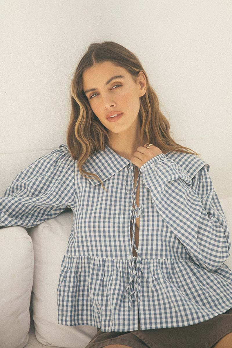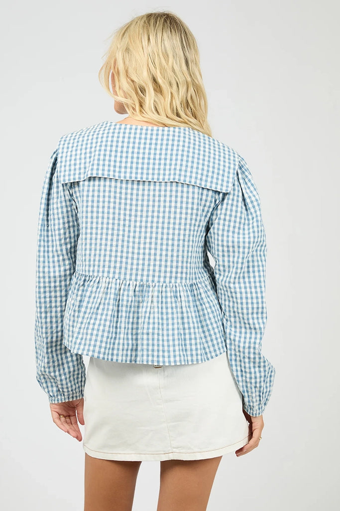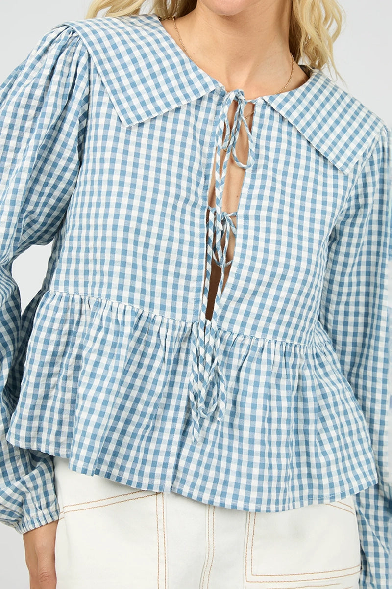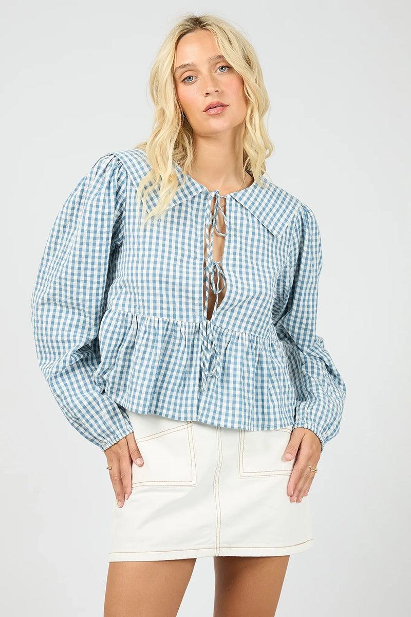 The Micky Long Sleeve Top brings a playful twist to everyday dressing with its blue checkered collar and gathered hem frill. A bodice seam adds soft structure, while three rouleau ties at the front give it that sweet, vintage-inspired charm. Style it with relaxed jeans or a tiered skirt for a fresh, feel-good spring look.
