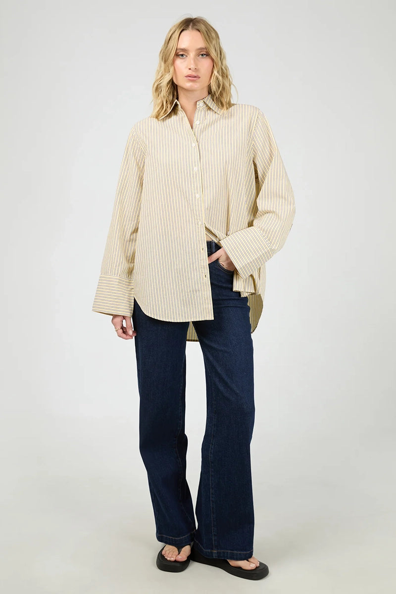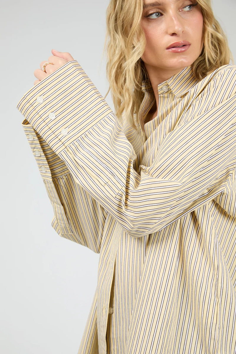 Brighten your wardrobe with the Nara Stripe Shirt, featuring bold yellow stripes on crisp, breathable 100% cotton. This classic button-down shirt offers a fresh, effortless vibe that works perfectly for layering or wearing solo. Pair it with your favorite jeans or tailored pants for a look that’s both sharp, sunny, and ready for any occasion.