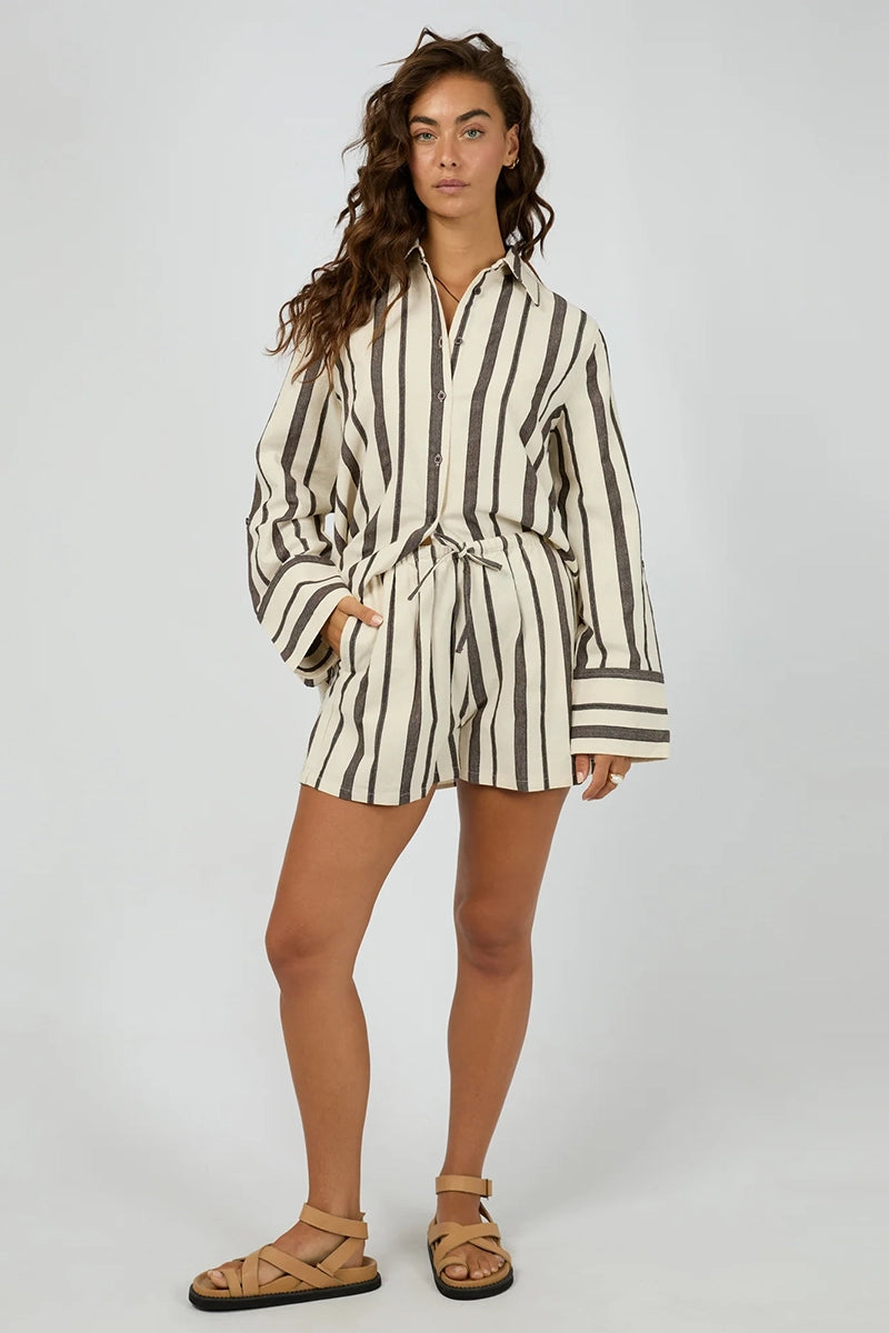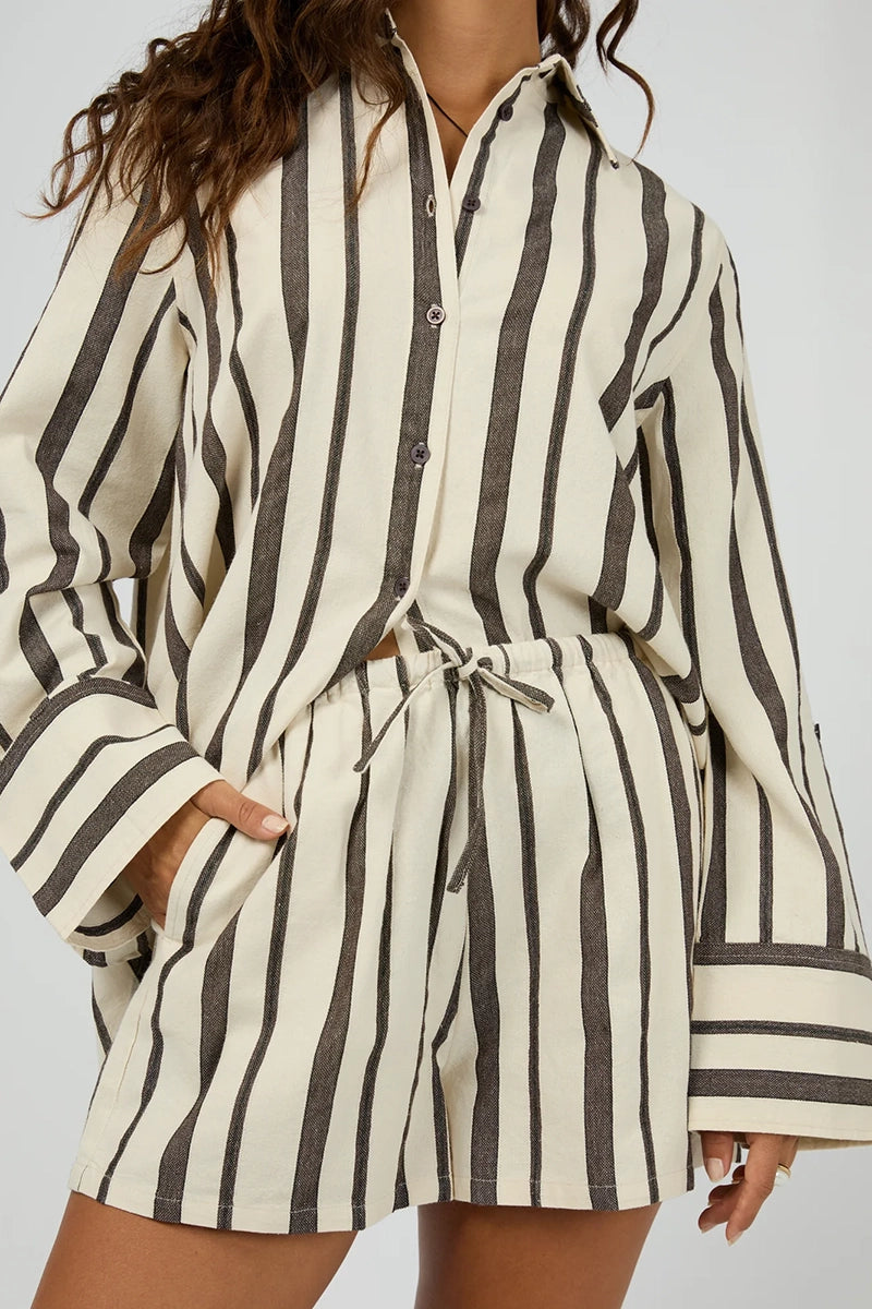The Rosa Stripe Shorts are a warm-weather must-have, crafted in a breathable cotton blend with classic brown stripes on a vanilla base. A soft tie at the front adds a relaxed, adjustable fit for all-day comfort. Pair them with the matching Rosa Stripe Shirt for an easy, elevated co-ord made for sunny escapes.
