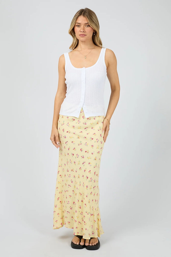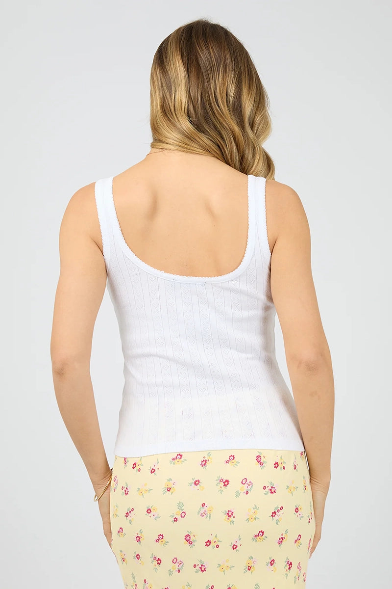 The Tia Tank is crafted from soft cotton pointelle in white, offering both comfort and a fresh palette. Featuring delicate buttons down the front, it can be worn fully done up or slightly undone for a more relaxed vibe. Perfect for layering or wearing solo with your favorite denim.