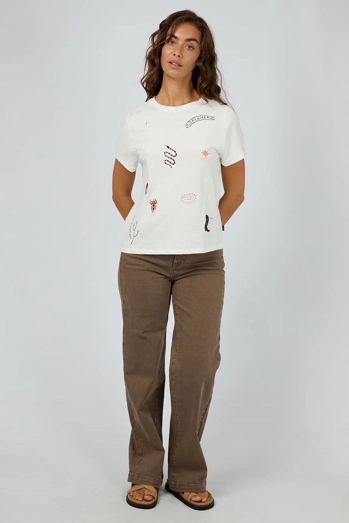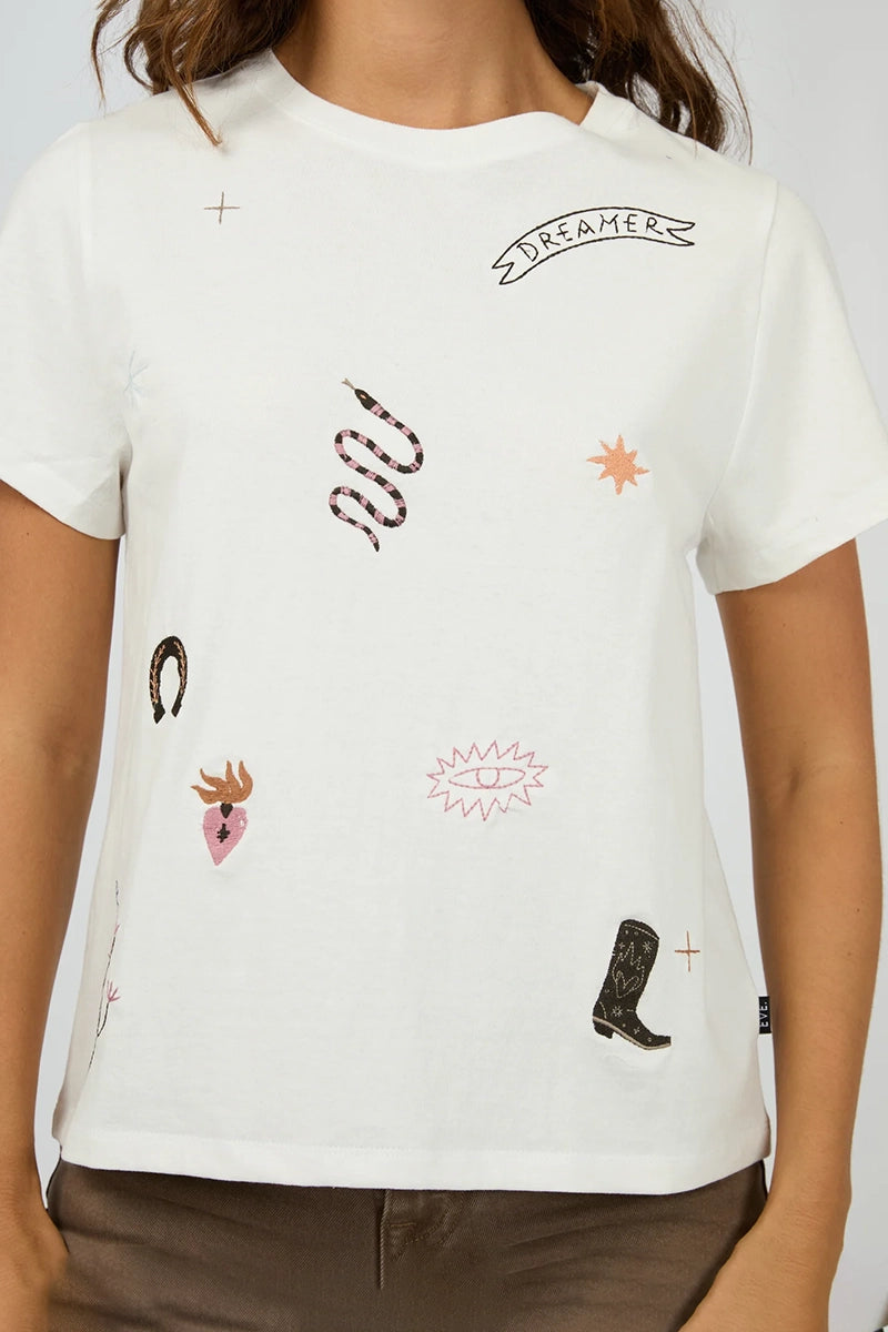 Channel laid-back desert vibes in the Western Dreamer Regular Tee, a crisp white staple with playful western stamp-style prints. Its easy fit makes it perfect for tucking into denim cutoffs or layering under a slip dress. A subtle nod to western flair, made for everyday cool.