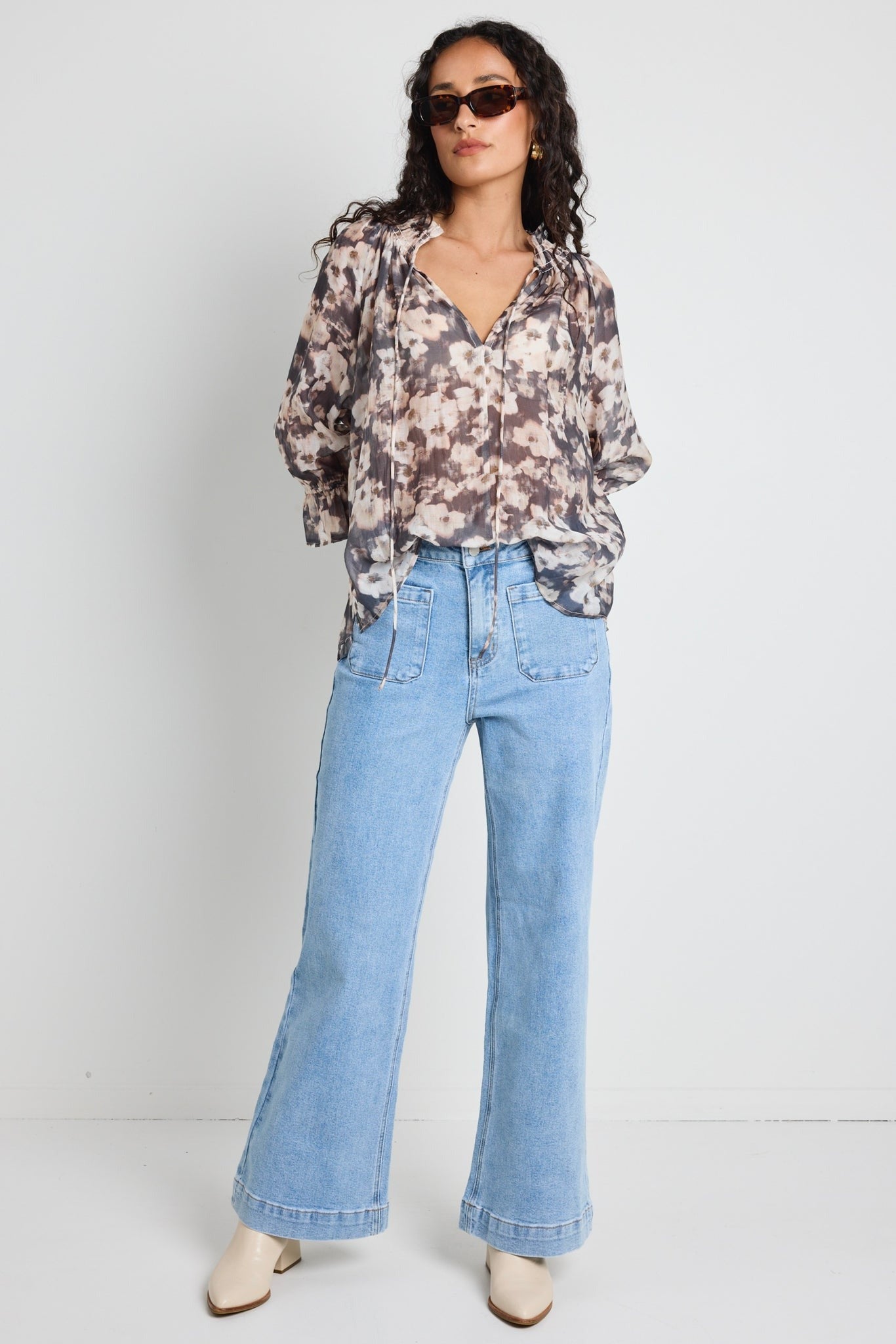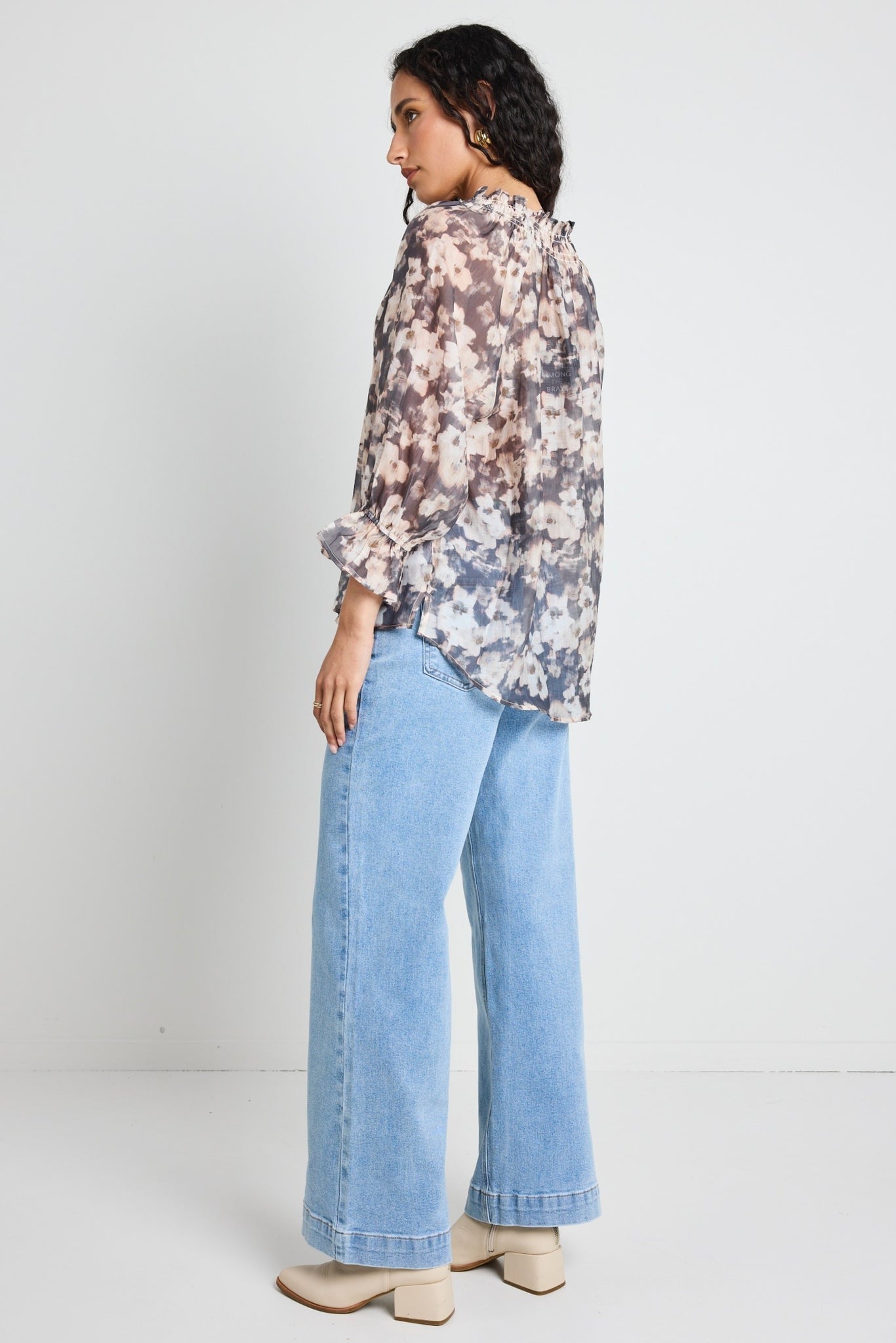 Discover the Expedition Top by Among The Brave, featuring a lightweight sheer fabric with a chic charcoal floral pattern. This relaxed-fit top with puff sleeves is perfect for pairing with jeans for a casual look or black pants for a sophisticated work-to-evening outfit. Elevate your style with this versatile staple!