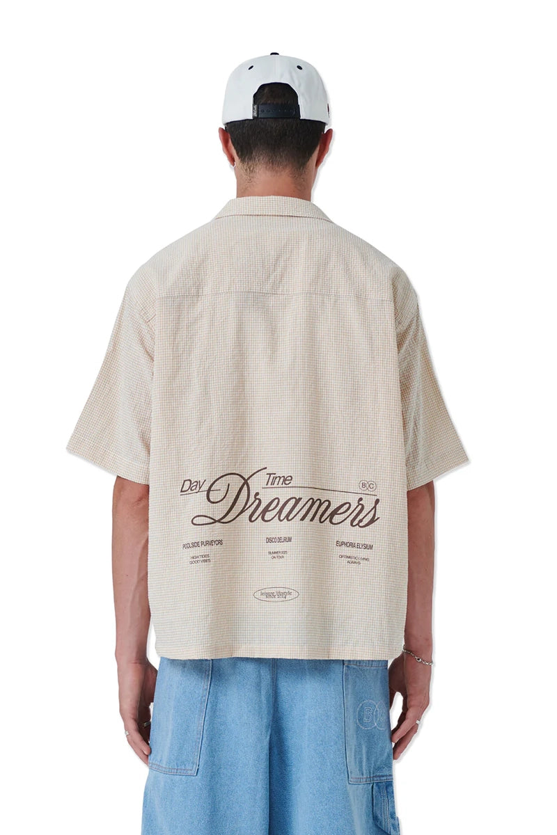 The DTD (Daytime Dreamers) Shirt. Lightweight gingham fabric with pocket flap embroidery and back screenprint. Boxy fit, resort collar and shorter length.