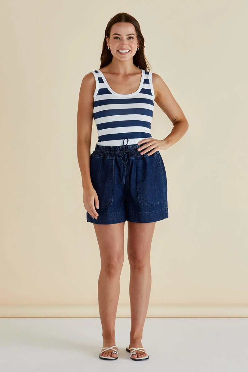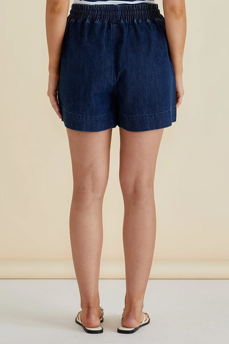 Designed for comfort and ease, the Relax Denim Shorts feature an elasticated waistband with drawstring for a perfect fit. Crafted from a soft denim feel, they have practical patch pockets and a mid-high rise silhouette. An effortless, elevated choice for transeasonal casual days. Classic style meets relaxed comfort.