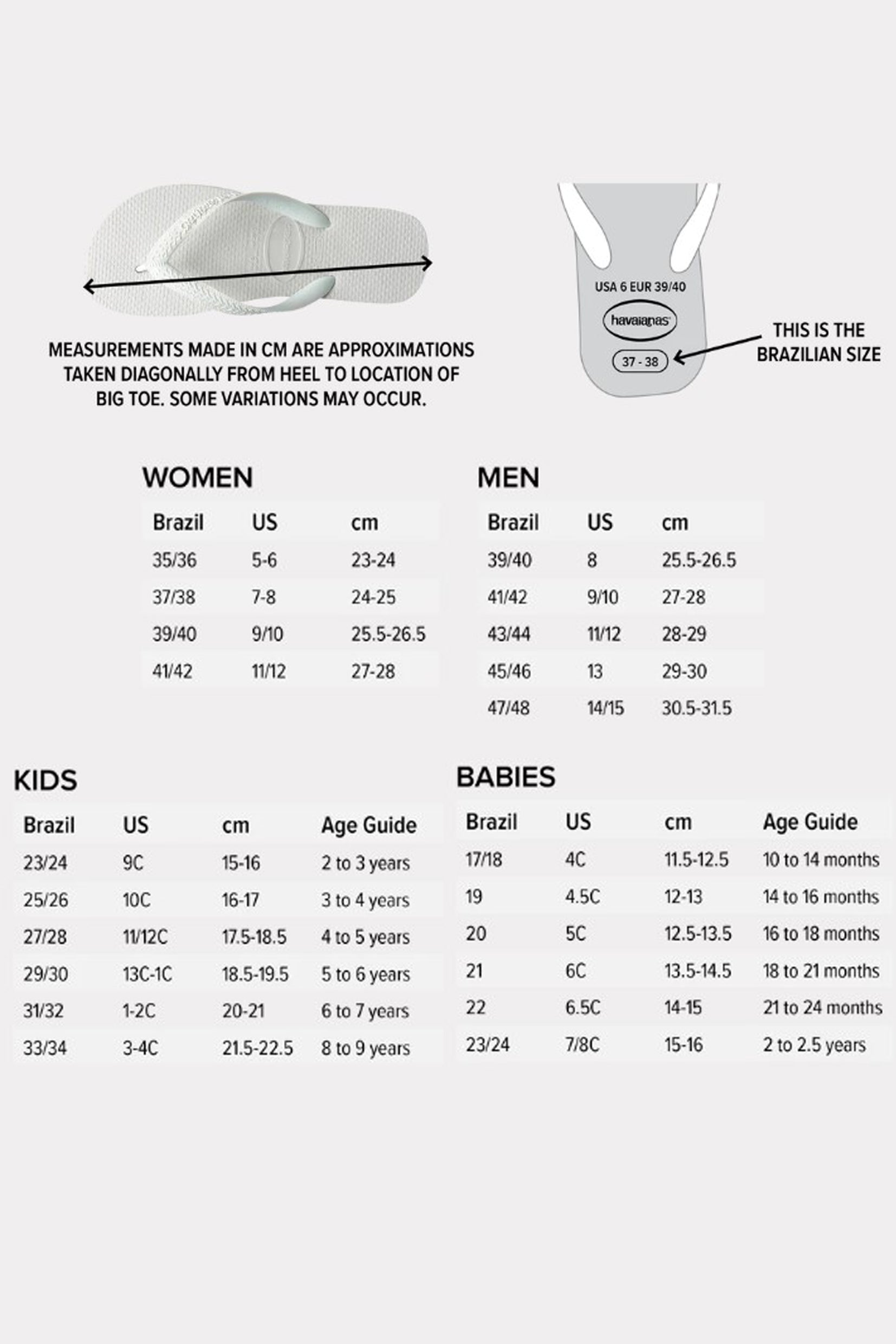 To find the best Havaianas size for you: Note that Havaianas = Brazilian sizing, which is different to European sizes. Refer to the size chart in images for Brazilian to NZ/US size and length (in cm) conversions.