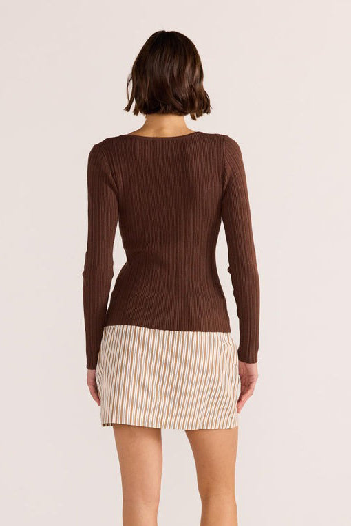 The Zinnia Asymmetric Knit Top by MINKPINK will become your next Autumn/Winter staple. Featuring a stretch knit fabrication, and a chocolate brown wash. Style yours with the new-in Artemis Belted Skort to complete the look.