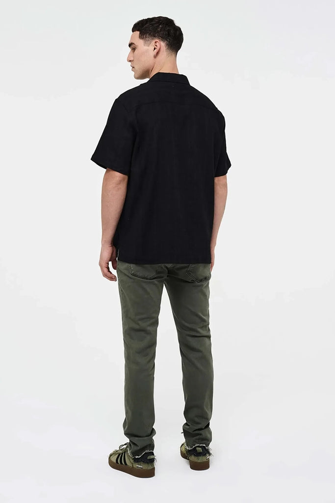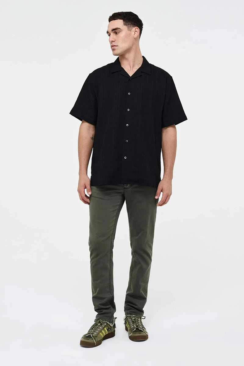 This straight jean maintains a consistent leg width from top to bottom with a slim silhouette