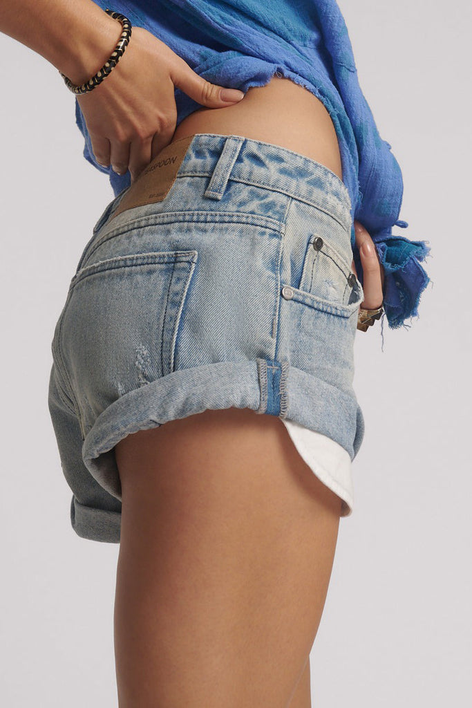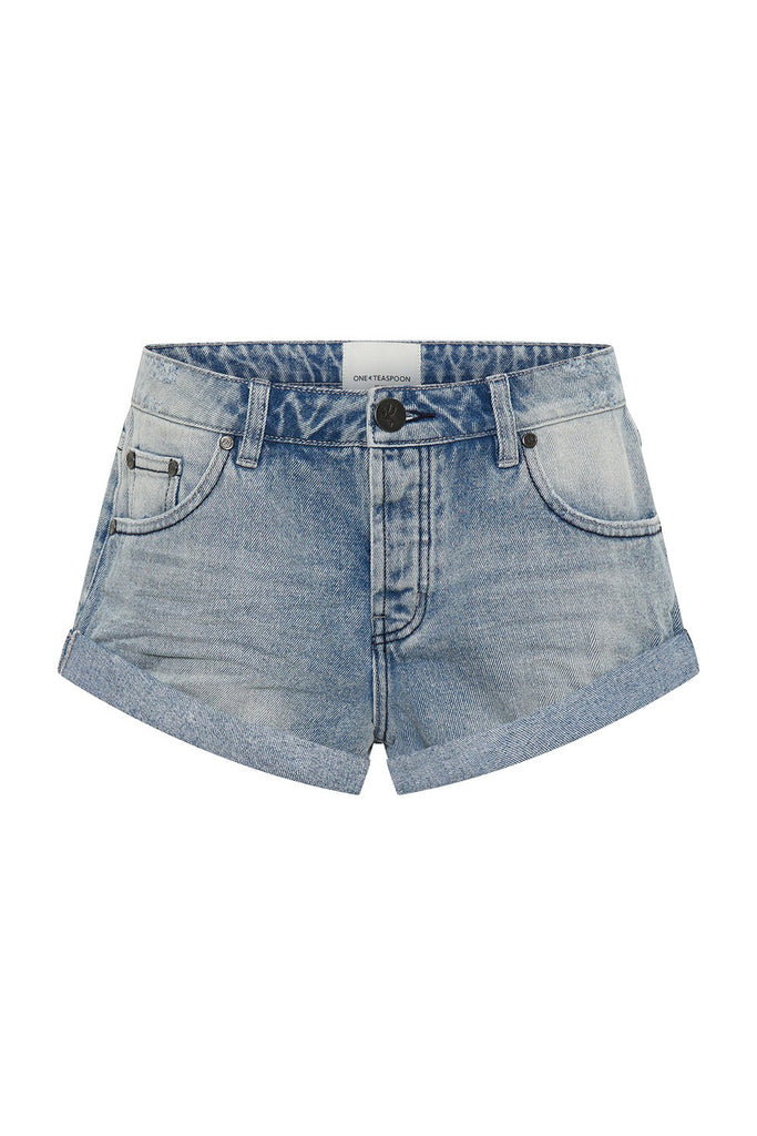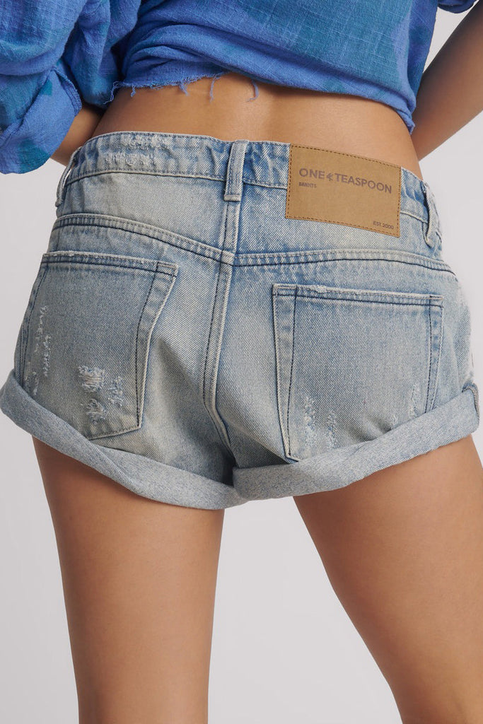 The LOW WAIST BANDIT is One Teaspoon cult classic short. The one and only. With large patch pockets. Low waist and relaxed in fit. It's slouchy in all the right places and includes our bower bird button and signature hem, rolled and twisted like a bandit. Designed to be worn low at the hips.