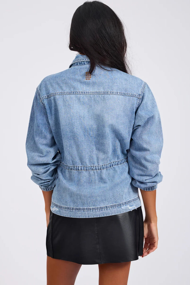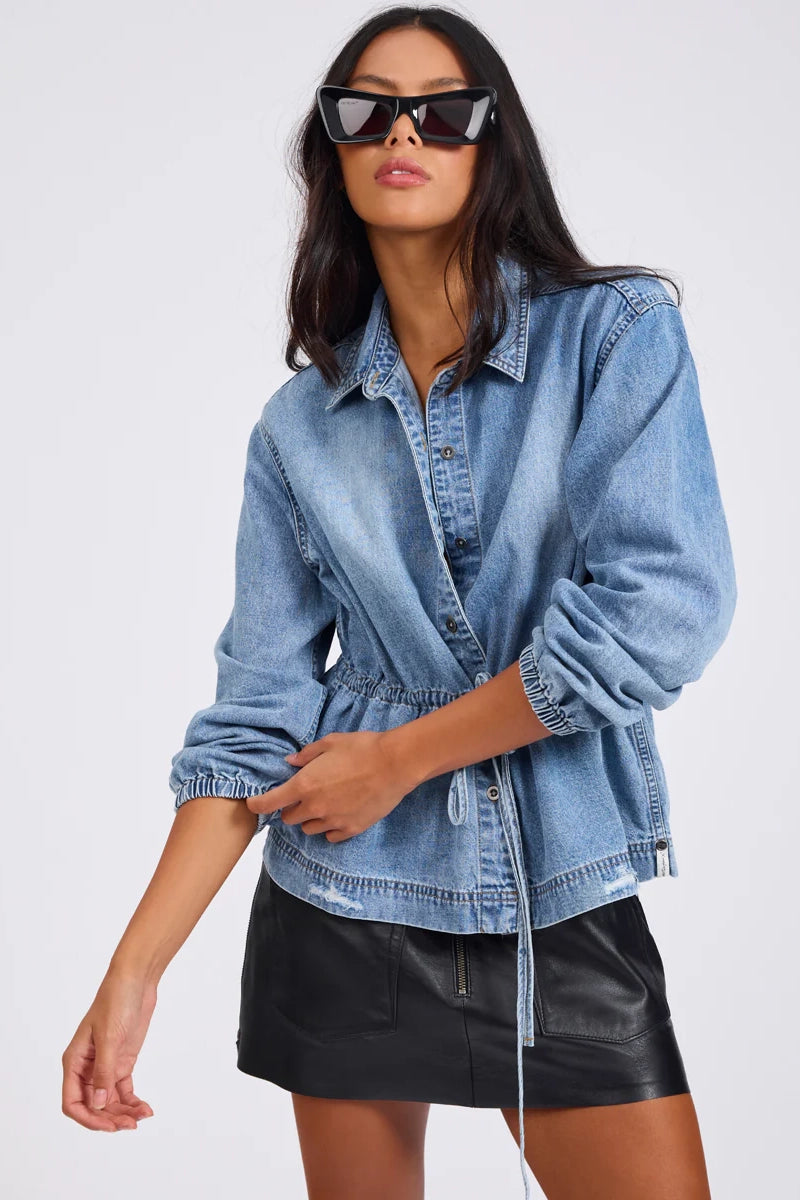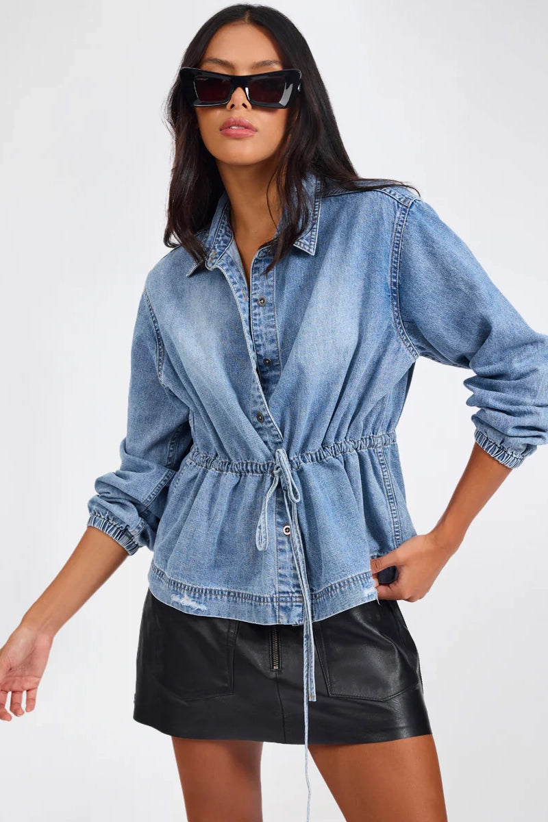 The WASHED BLUE DRAWSTRING DENIM SHIRT is a laid-back essential with a feminine edge. Cut from lightweight chambray denim with a cinched waist and bubble sleeves, it blends structure and ease perfectly.