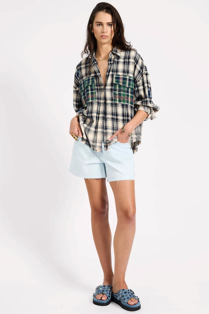 Bring the attitude. The Cream Blue Check Flannel Star Studded Shirt takes a classic flannel silhouette and amps it up with rebellious detail. Contrast chest pocket, studded stars, and raw-edged appliqué patches elevate this oversized staple into something unforgettable.