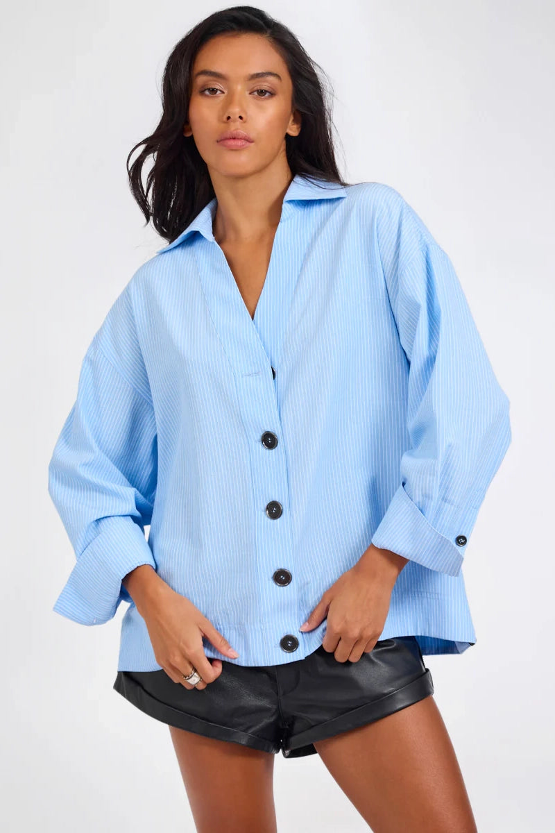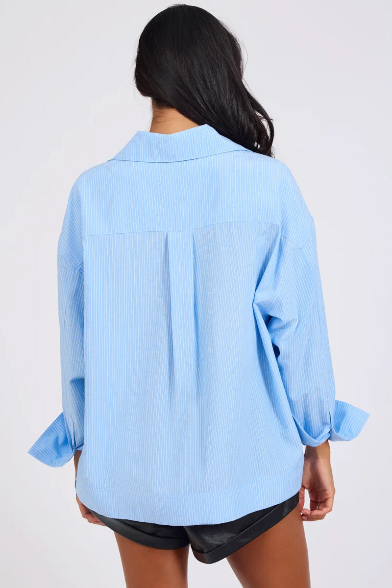 Crafted in a soft baby-blue pinstripe cotton blend, it drapes perfectly for that undone, nonchalant fit. Wear it loosely tucked into denim jeans, pair with denim shorts for a relaxed off-duty moment, or layer it over simple tanks for a cool contrast.