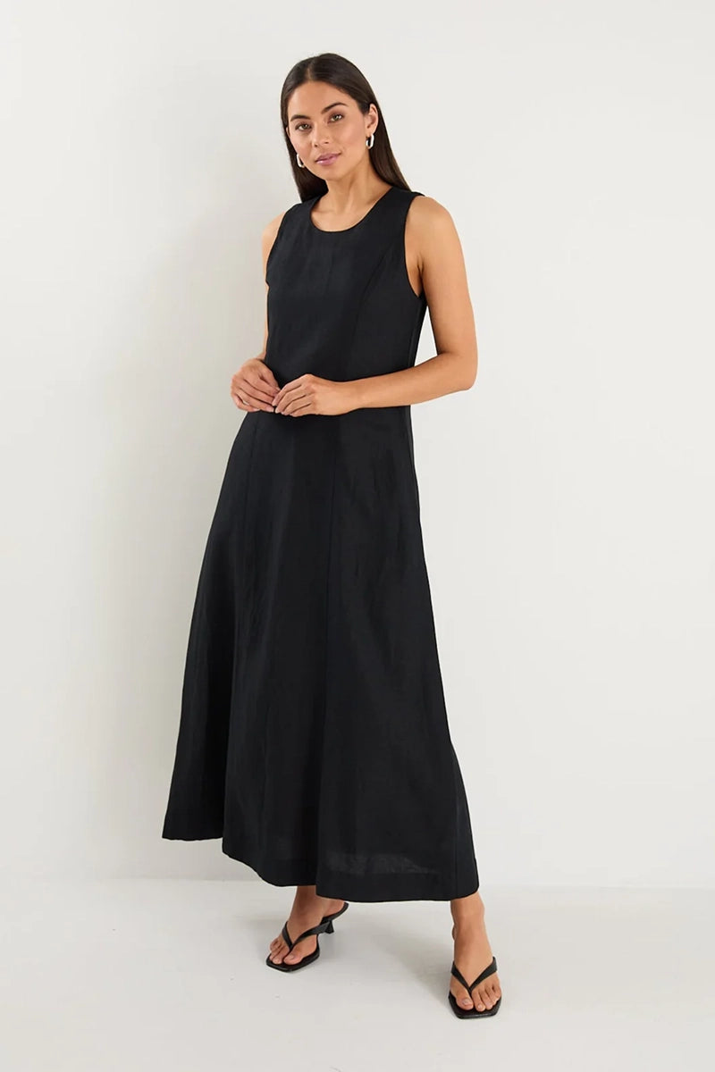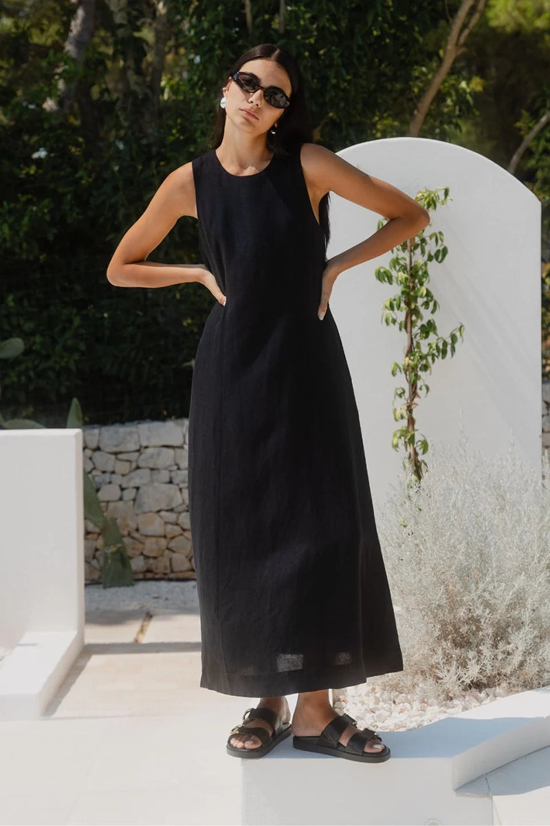 The Easygoing dress is crafted from a luxurious linen blend that will keep you cool all summer long. A conscious choice, this garment is made from natural fibres. Featuring a flattering crew neckline, sleeveless design and pockets this dress will be your favourite throw on and go midi.