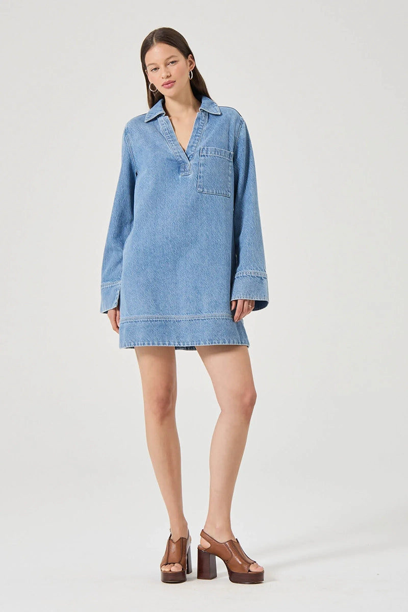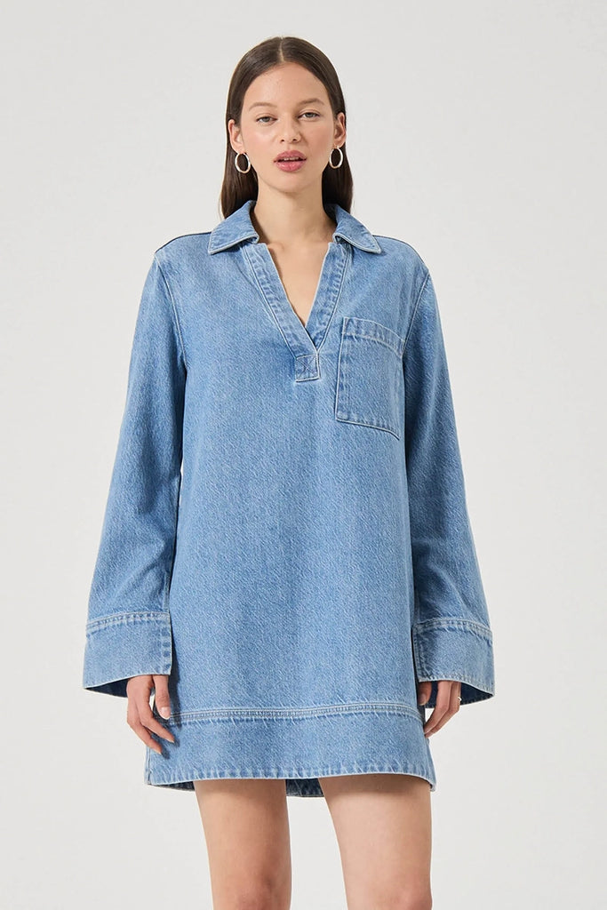 Relaxed fit mini denim dress with a structured tailored collar and button front placket
