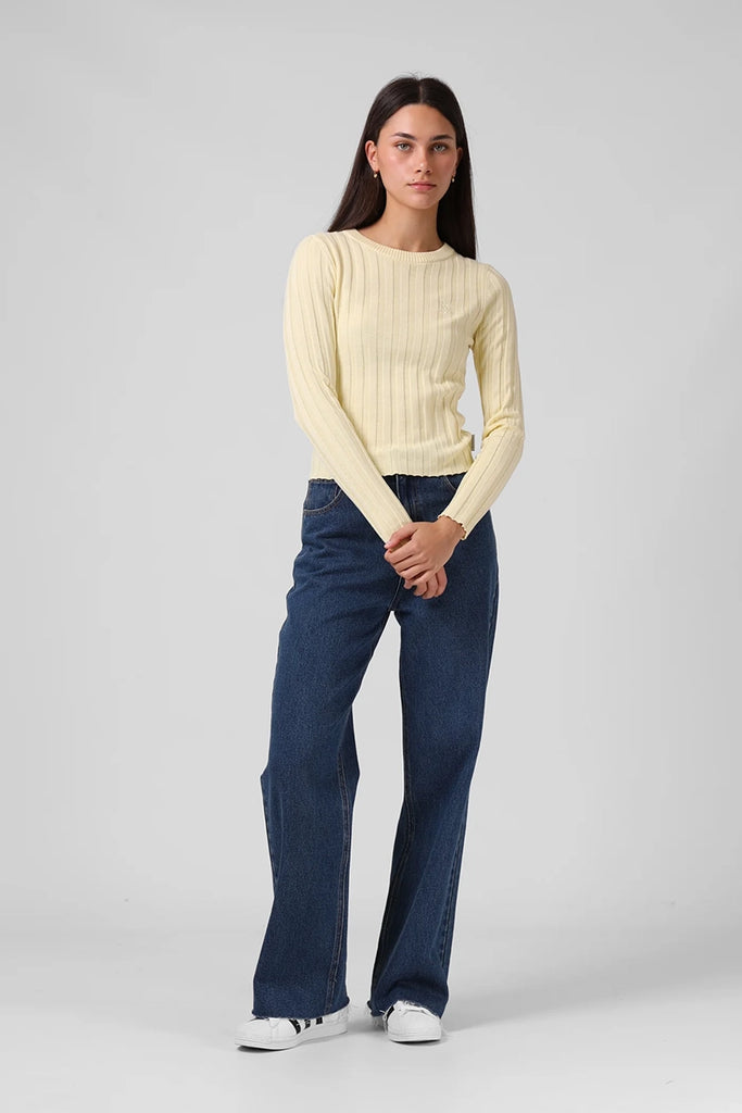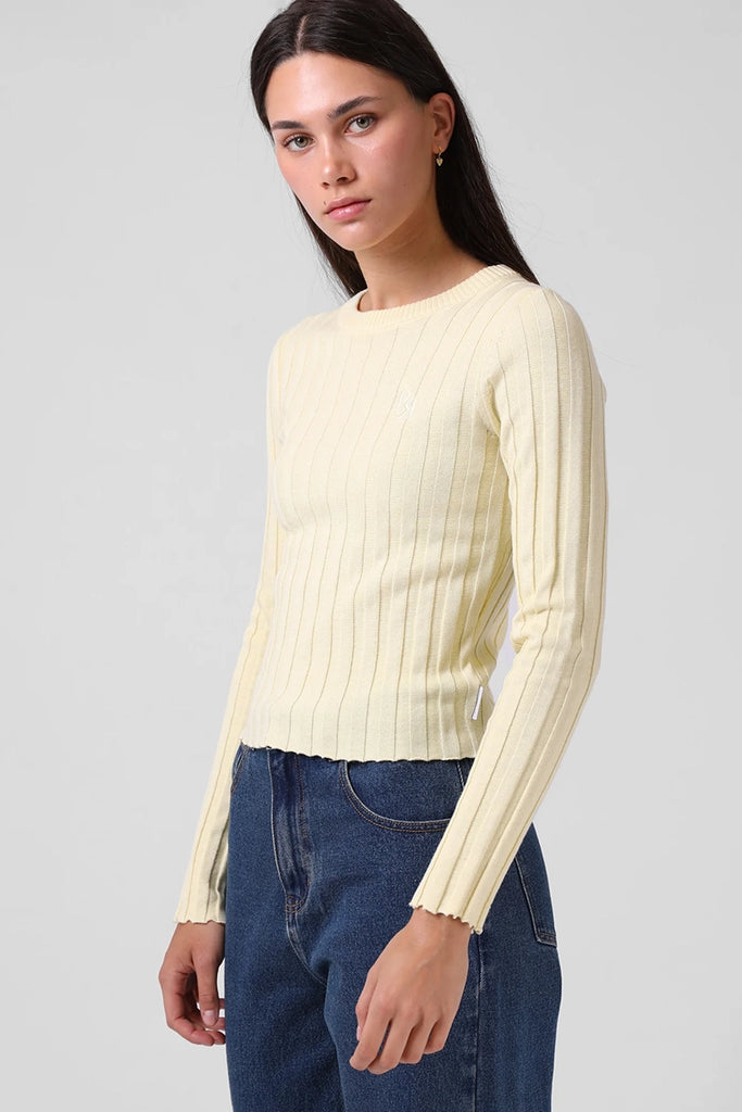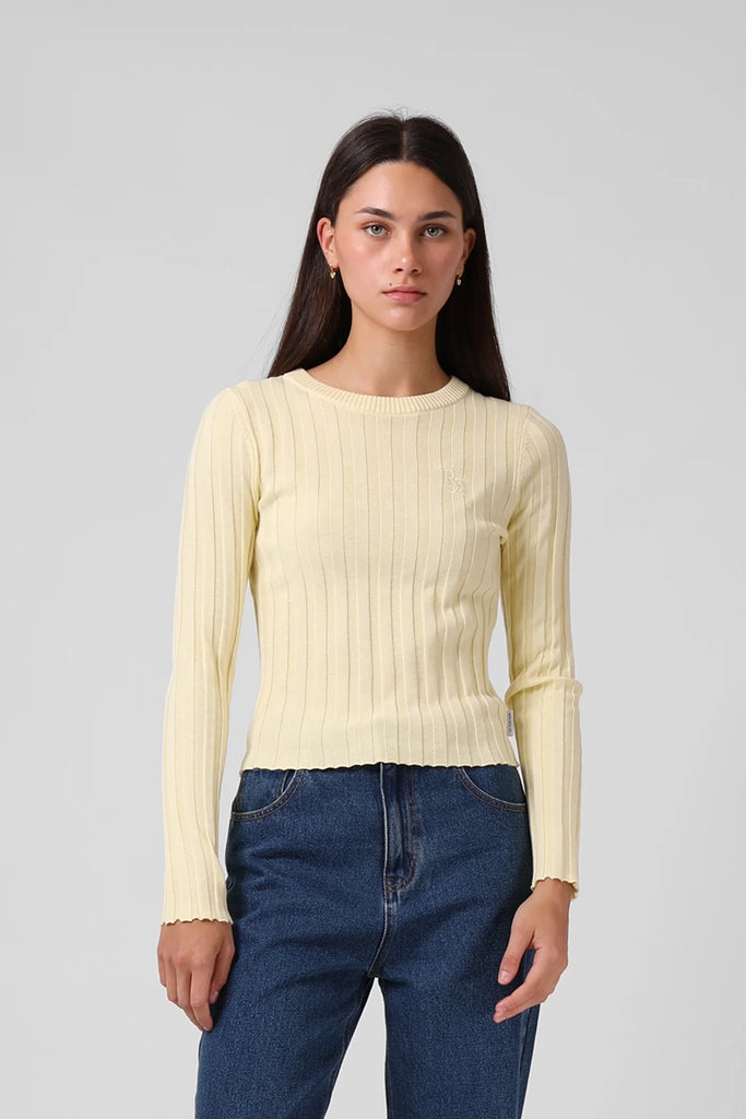 55% Acrylic / 45% Cotton, Light weight, stretchy knit fabrication, Wide Rib, Slim Fit, Lettuce Edge Finish on Sleeves & Hem, Minimal Embroidered Chest Logo