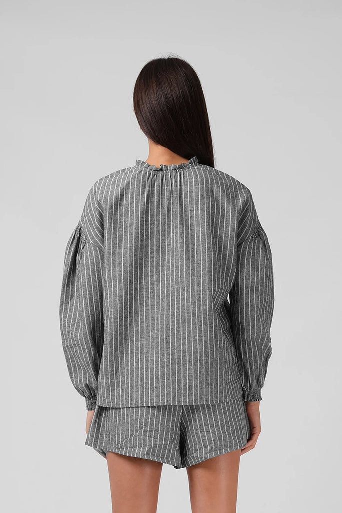 55% Linen / 45% Cotton, Lightweight Material, Relaxed Fit Blouse, Stitch detailing at shoulder seams, Frill Neckline, Button up front