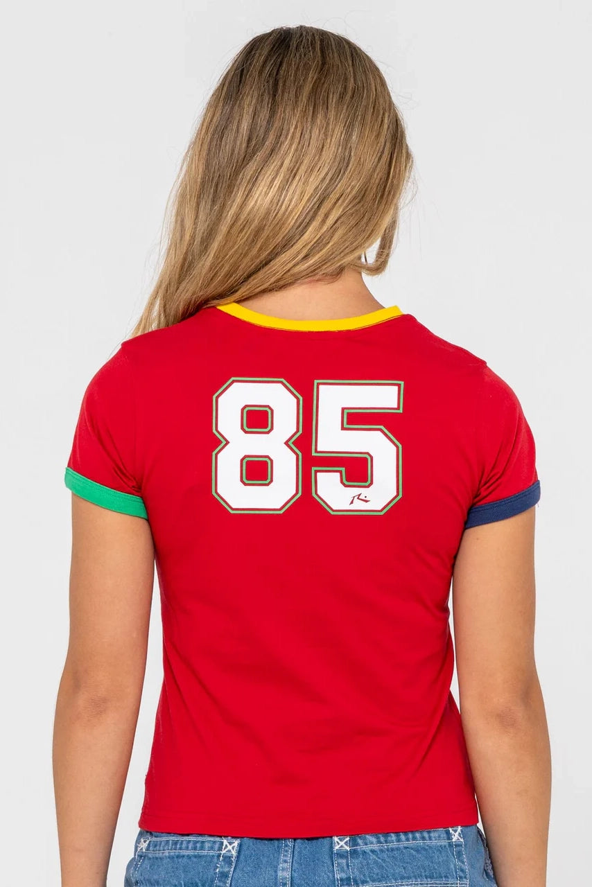 Short Sleeve Baby Tee With Contrast Binding And Front & Back Graphic. 100% Cotton Midweight Jersey