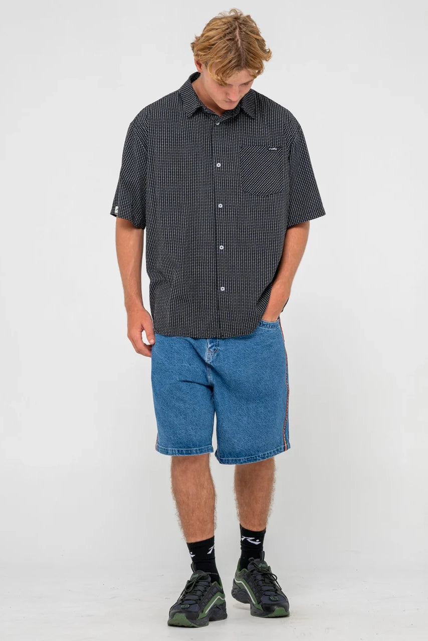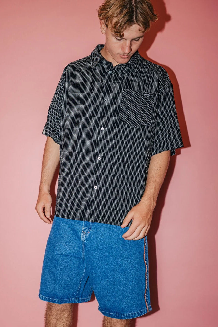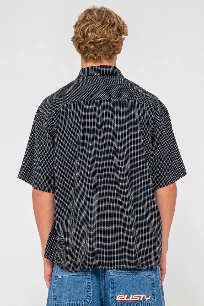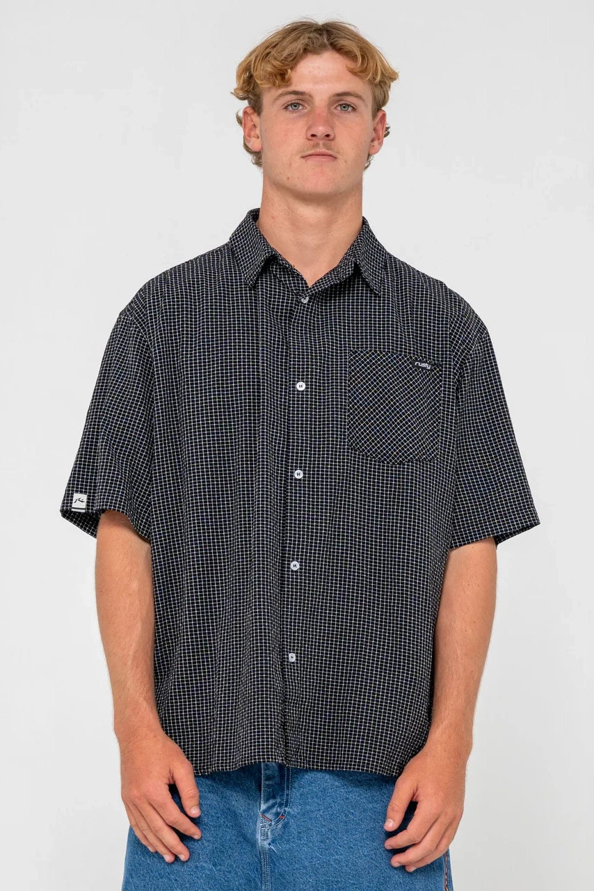 R2K Fit Shirt With Diagonal Cut Chest Pocket And Drop Curved Hem. 100% Cotton Mini Check