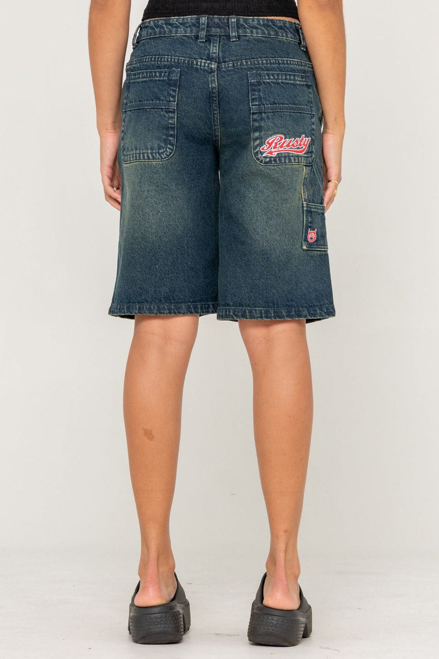 Low Rise Relaxed Fit 21" Outseam Jort With Carpenter Details. 100% Cotton Indigo Denim