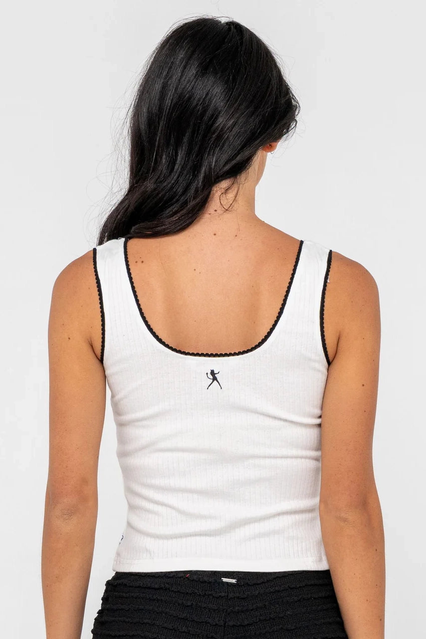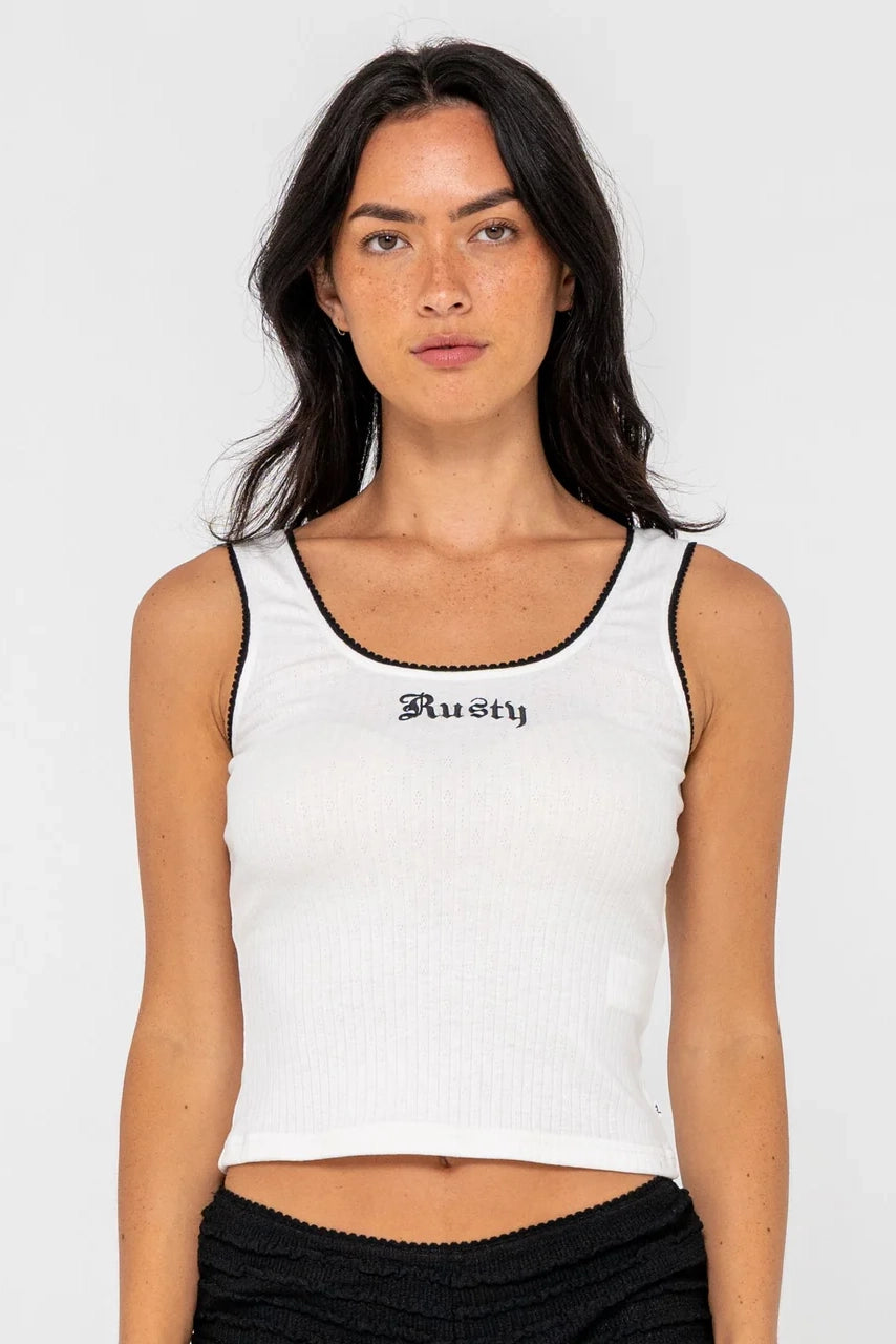 Slim Fit Standard Length Singlet With Logo Embroidery And Contrast Lace Trim. 65% Polyester 28% Rayon 7% Spandex Pointelle