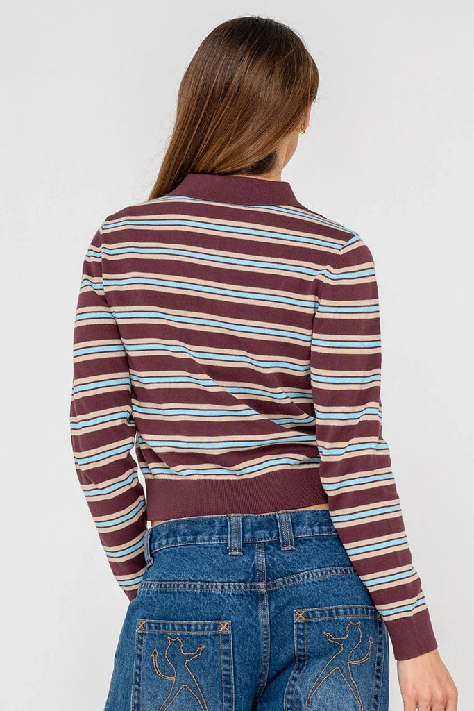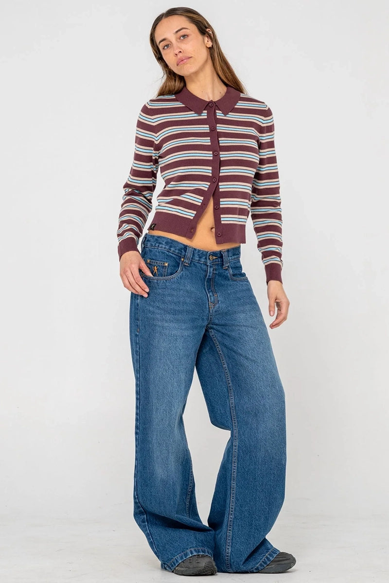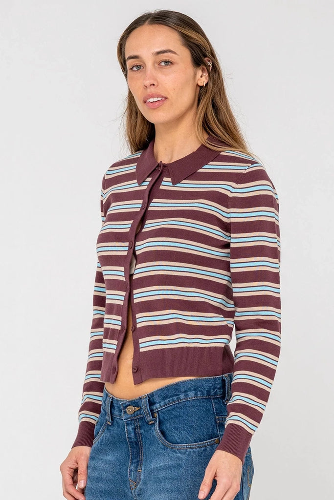 Button Down Stripe Cardigan With Contrast Collar And Rib. Yarn