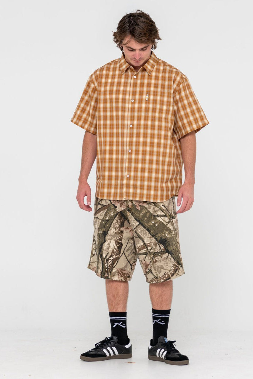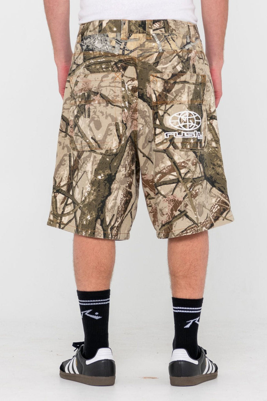 Baggy Fit (Fixed Waist) 22 Outseam Jort With All Over Camo Print And Rusty Embroidery. Material: 340gsm 100% Cotton Camo Twill Baggy Fit Fixed Waist Oversized Pockets Embroidered Length: 22 Inch
