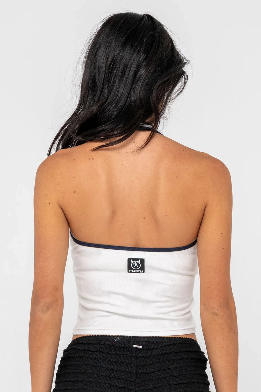 Ribbed Halter Neck Fashion Top With Back Woven Patch Logo. Ribbed Jersey