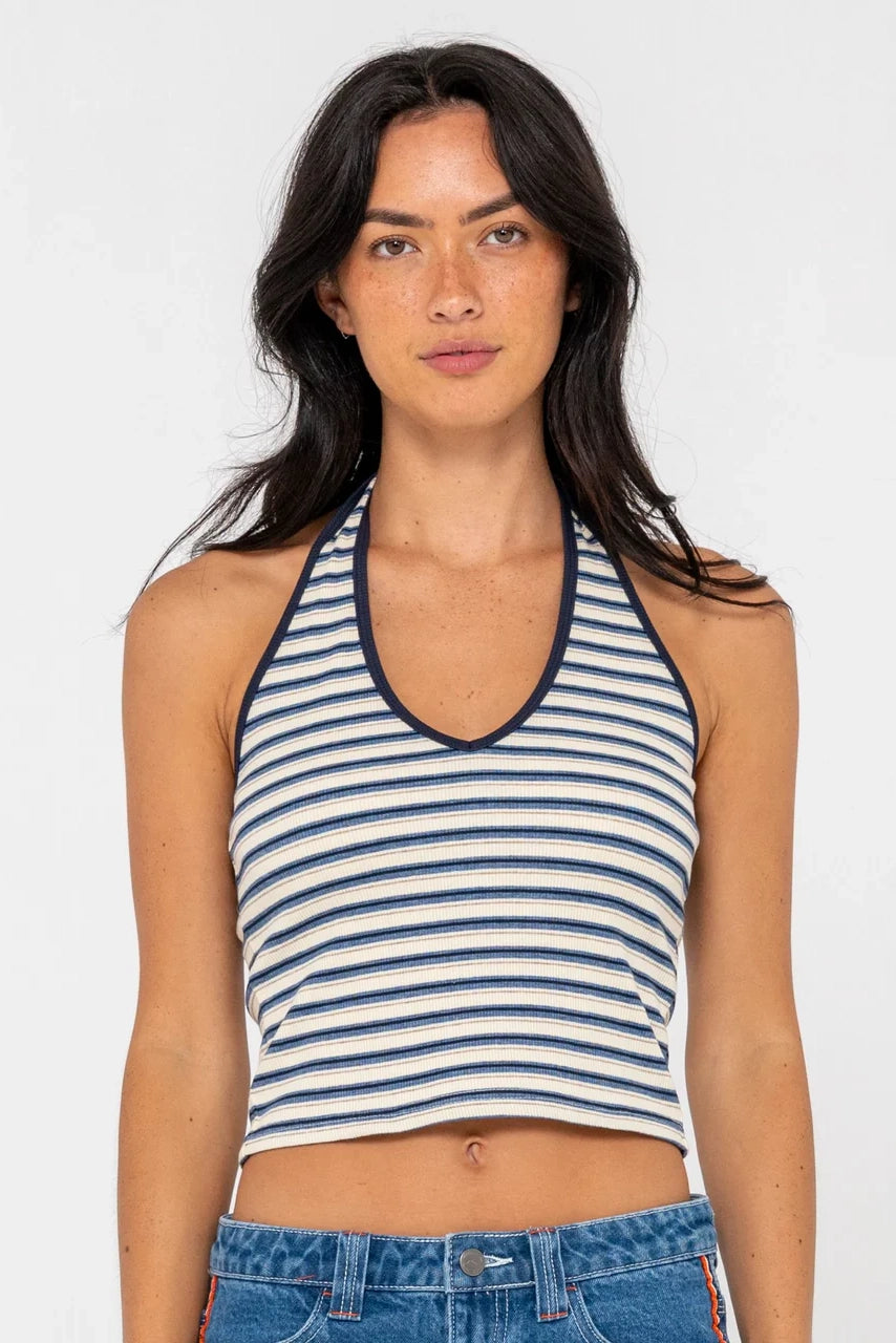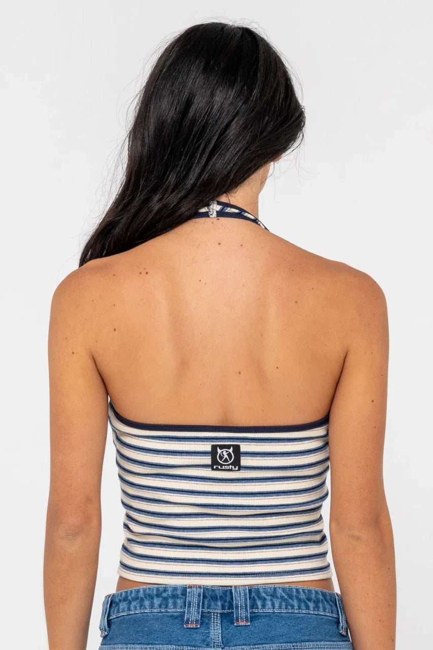 Ribbed Halter Neck Fashion Top With Back Woven Patch Logo. Ribbed Jersey