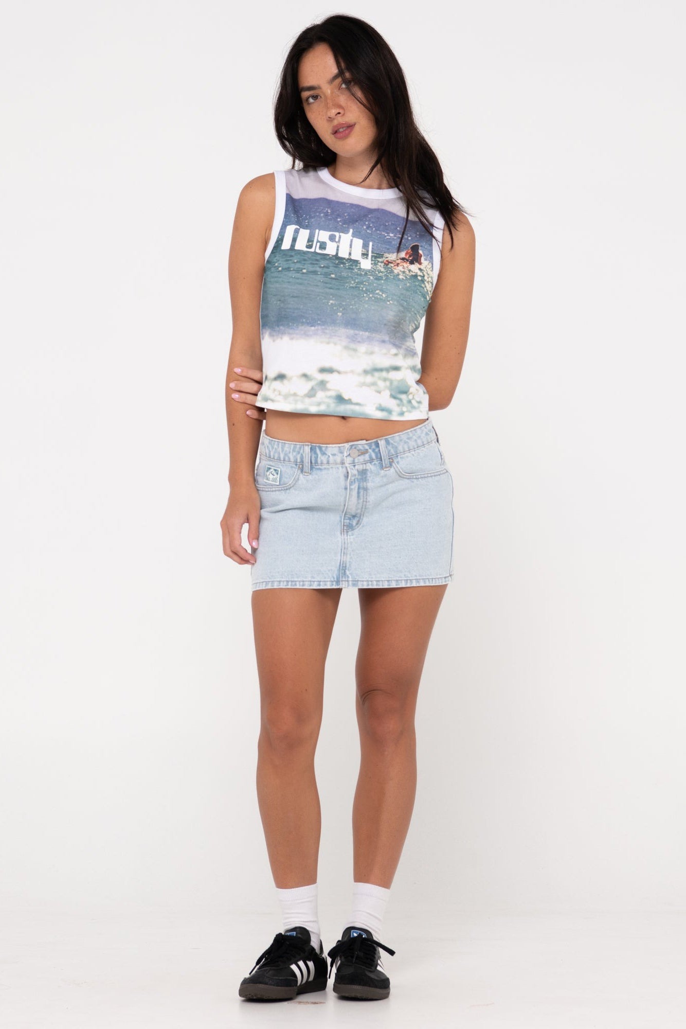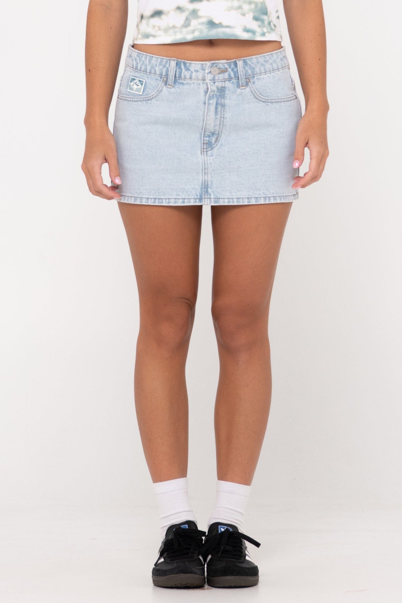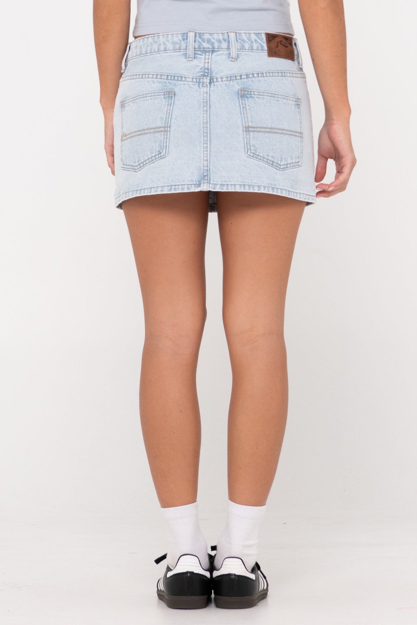 Mini Low Rise Denim Skirt. Material: 100% Cotton Rigid Denim 12 Oz