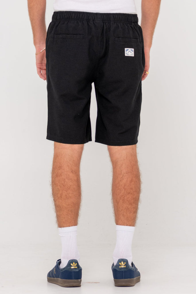 Straight Fit Elastic Waist Walkshort With A 20 Inch Outseam And Silicon Wash. Material: Rayon / Linen Blend - 70% Rayon 30% Linen