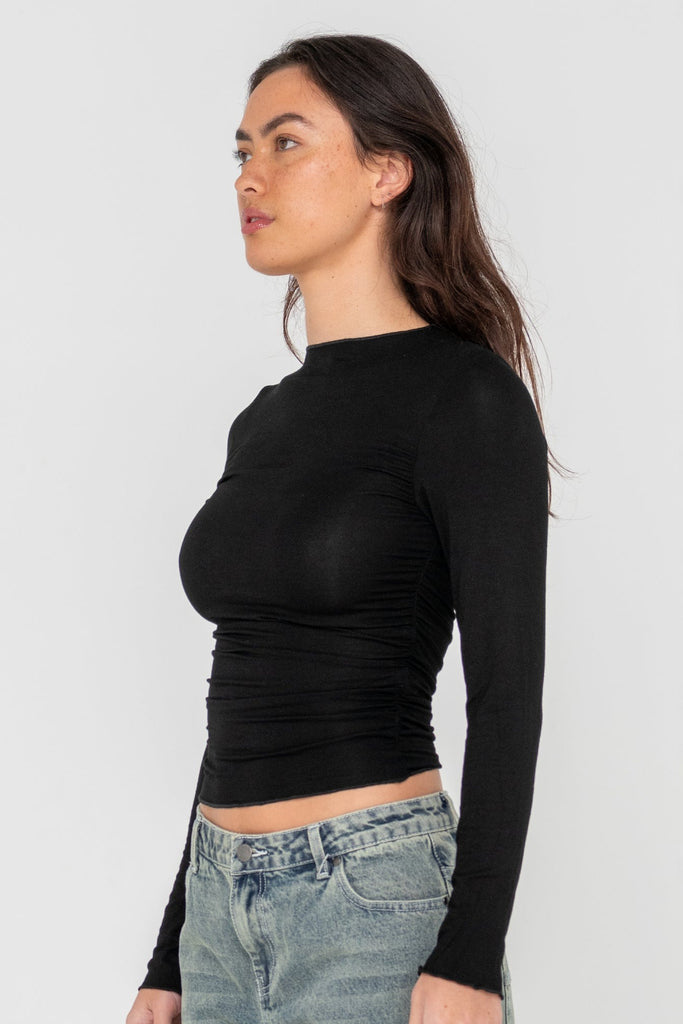 Long Sleeve Ruched Fashion Top With High Neck. 95% Rayon / 5% Spandex