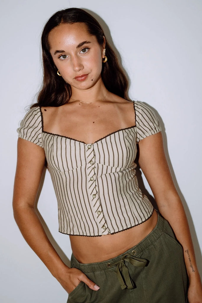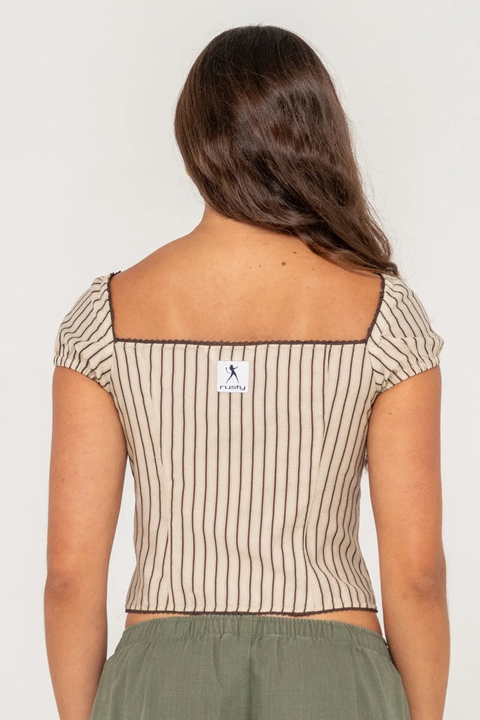 Fitted Fashion Top With Button Detail And Elasticated Sleeves. 85% Rayon / 15% Polyester