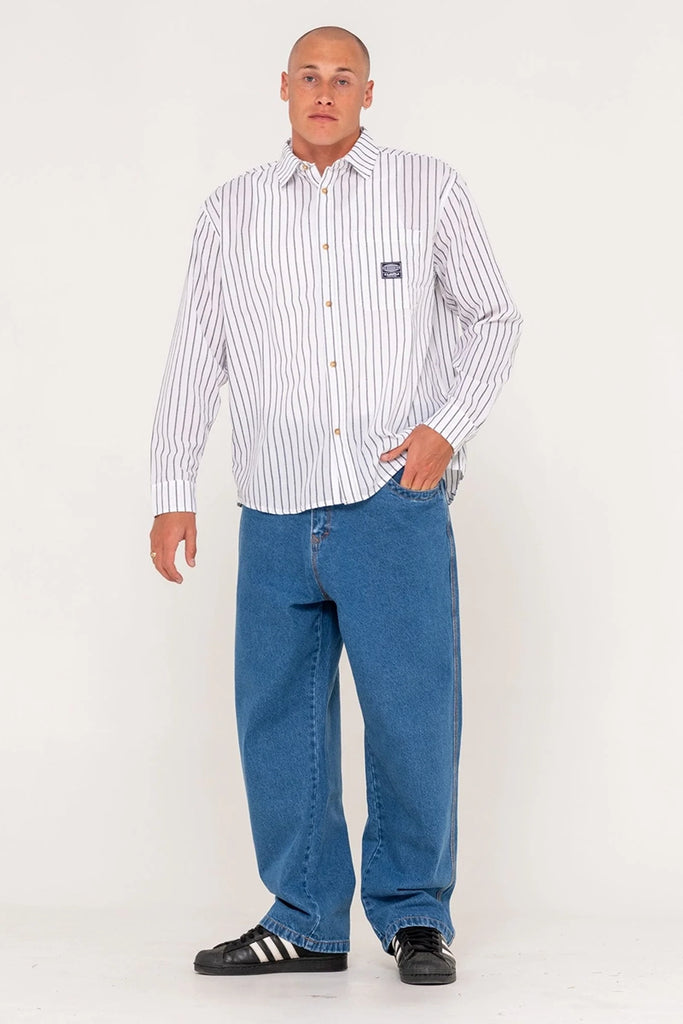 R2k Boxy Fit Woven Shirt With Curved Hem - Chest Pocket. Heavy Oxford Pinstripe