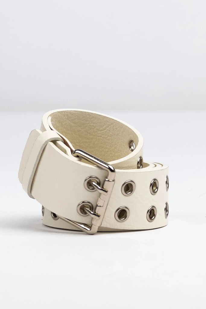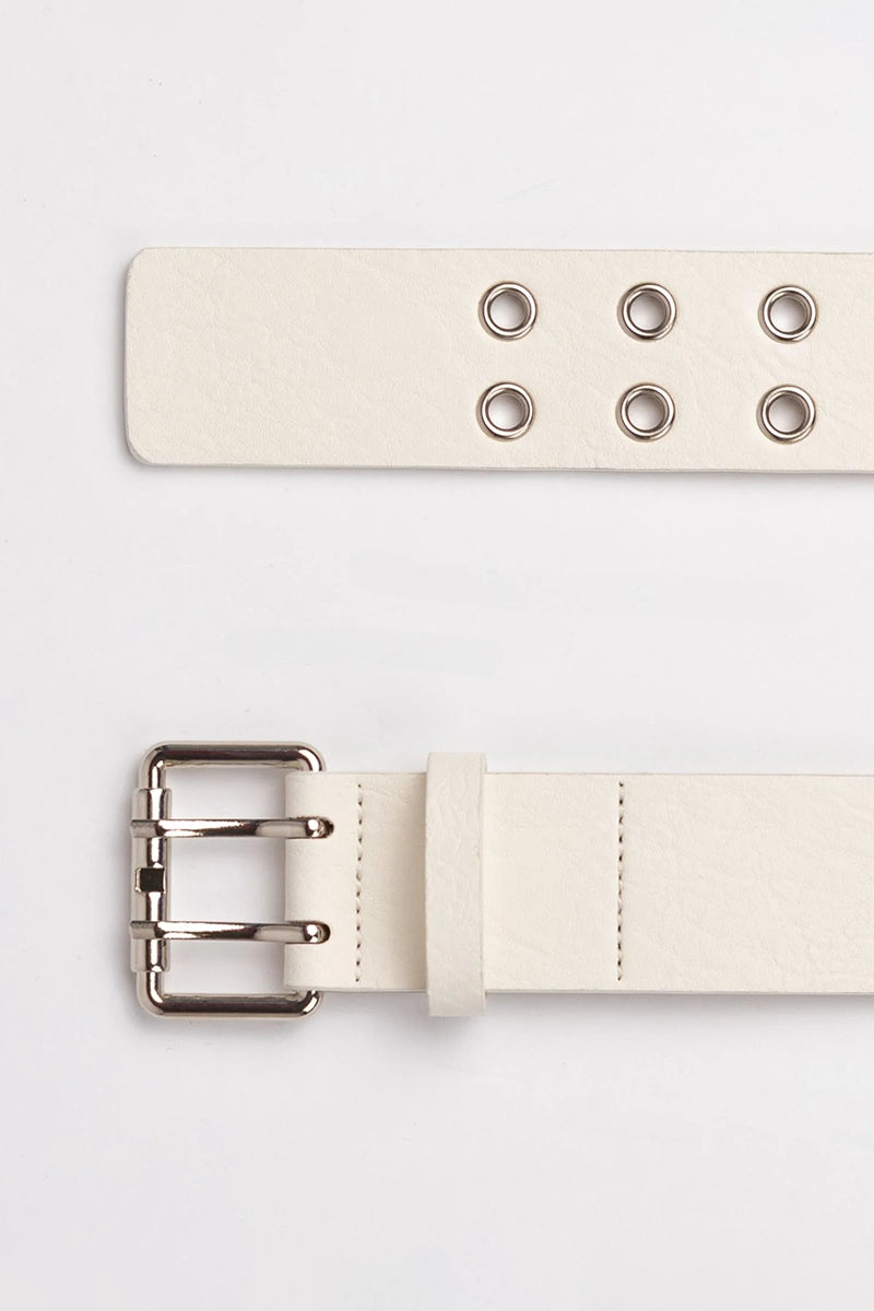 Nothing like a riveted to bring back the sweet sensations of the early 2000. Leather Look Belt With Double Prong Buckle And Metal Eyelets. Grained Vinyl Calfskin Look