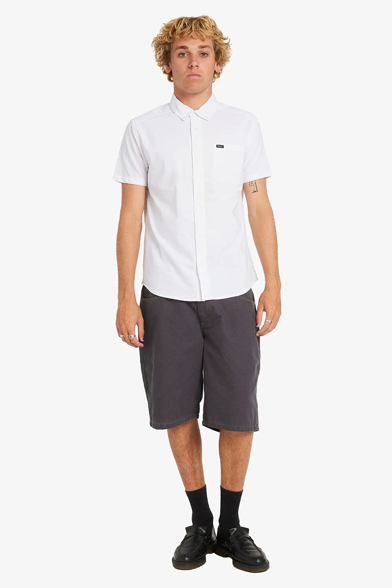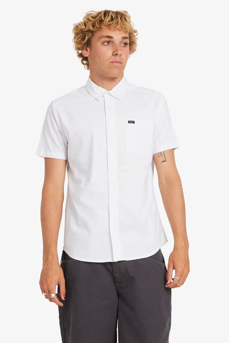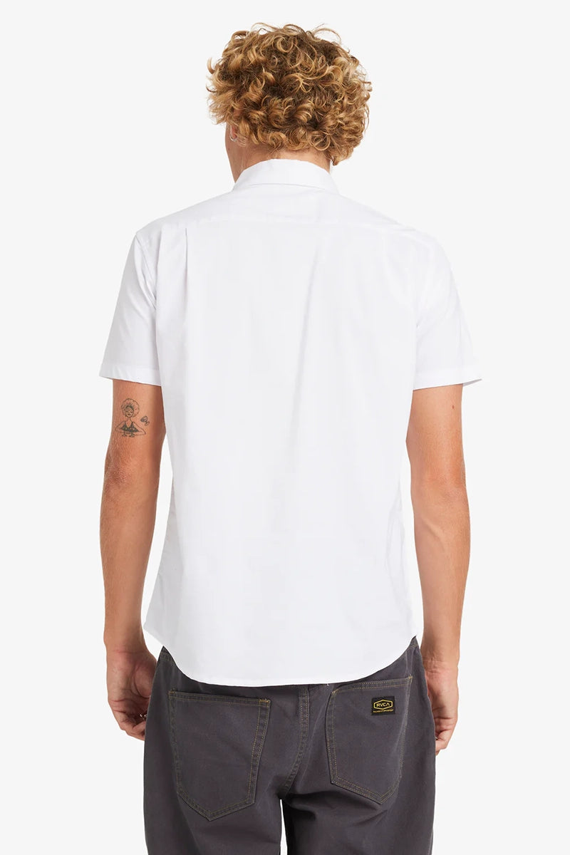 The RVCA that'll do shirt puts style and comfort in the game with a slim fit, stretch cotton blend, button down collar, and scalloped hem. Featured here in the white colorway.