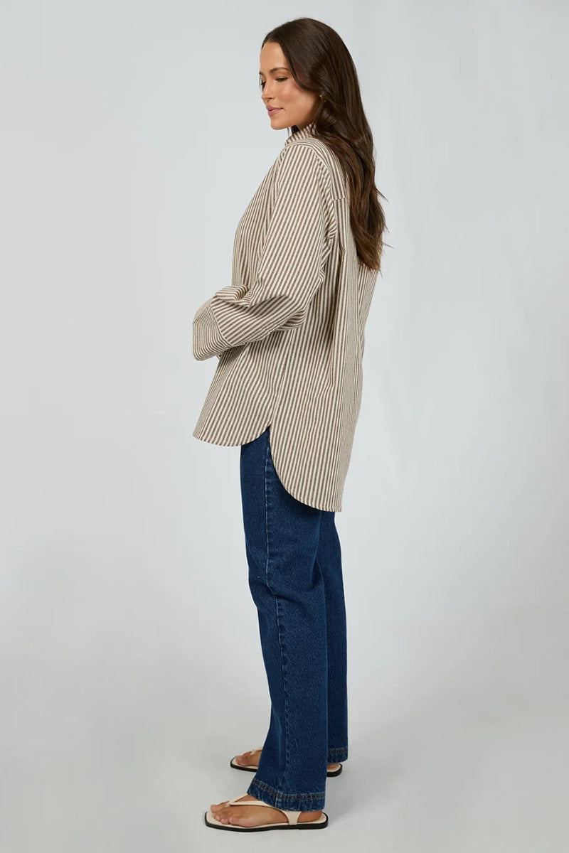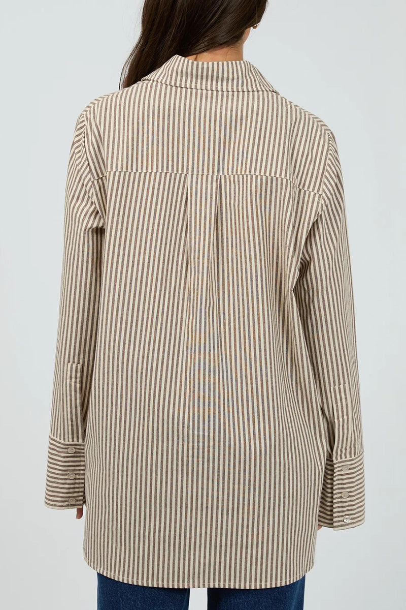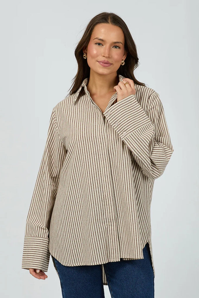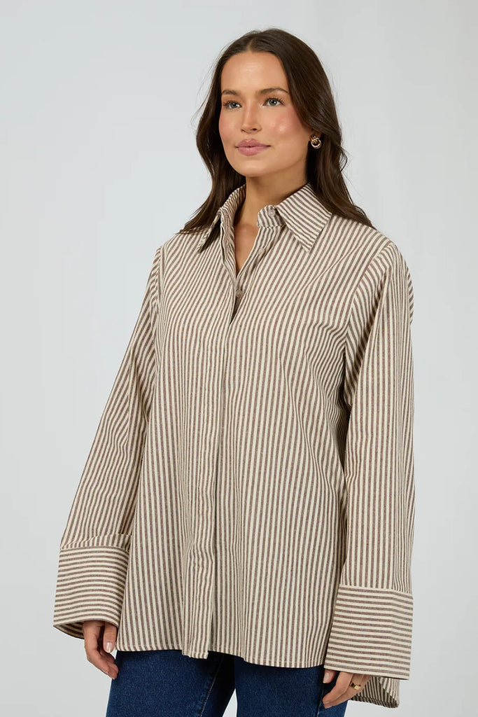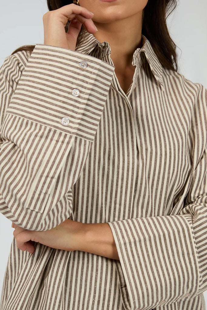 Meet your new go to throw on and go shirt, introducing the Sunday Long Sleeve Shirt. Featuring a flattering chocolate and natural stripe this shirt has a covered placket and wide cuff detail. Pair back with your fave denim or throw over a casual outfit for a more casual look.