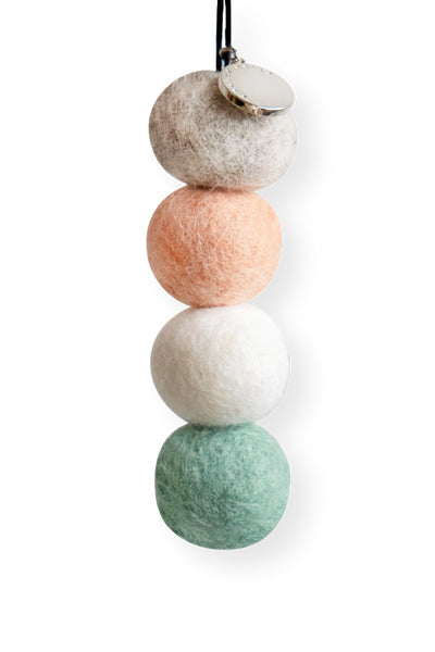 4 Unscented Felt Balls with branded charm and elastic string for easy hanging.