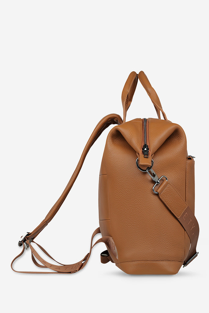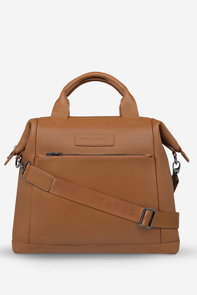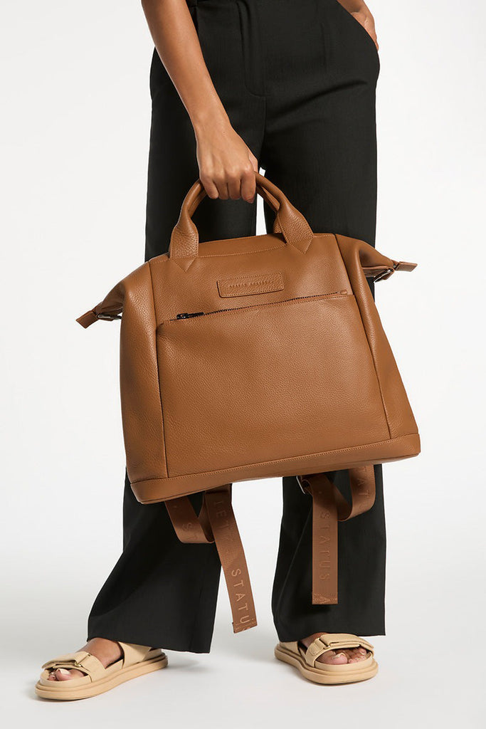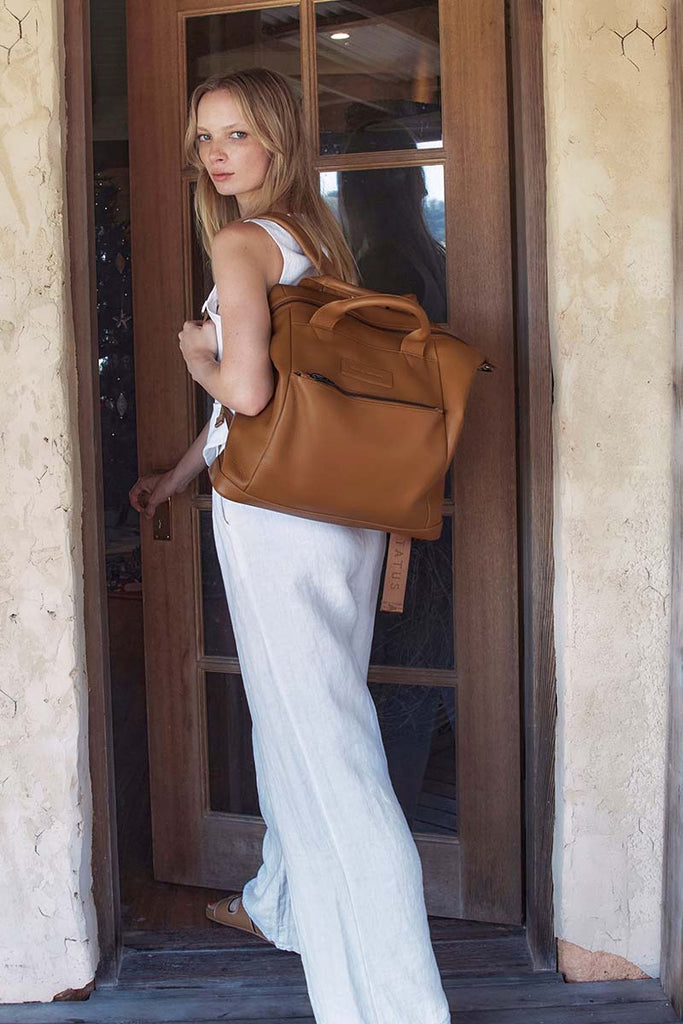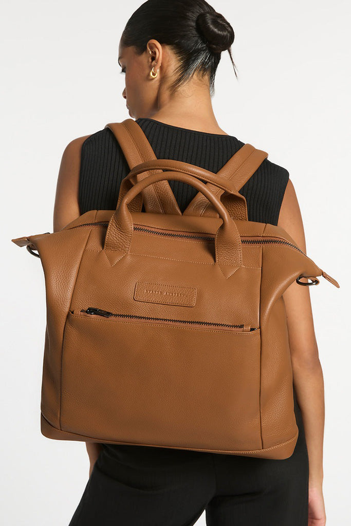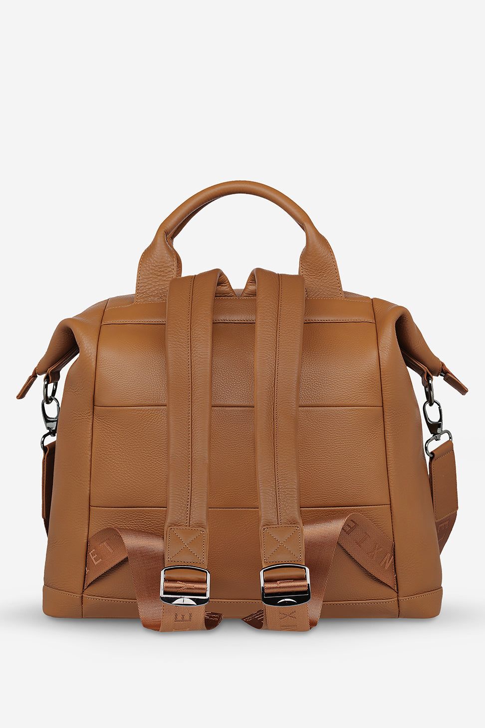 Made to double as an oversized backpack or baby bag. The 'Comes In Waves' bag has enough space and pockets to keep everything in just the right place, and can be clipped onto the handle of a pram with our 'Up All Night' baby bag straps (sold separately). Soft shrunken pebble leather Custom Status Anxiety lining Front zipper pocket Internal zipper pocket, and open pouch pockets Internal bottle pockets Internal key clip Zipper close Padded shoulder straps Fits a 16 inch MacBook Comes in a Status Anxiety branded drawstring bag