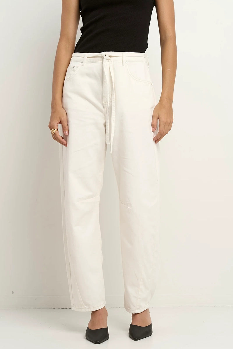 Meet your new off-duty essential these high-rise, barrel leg jeans are crafted from 100% cotton for a structured yet comfortable feel. Designed in a soft ecru wash denim, they bring effortless style to your everyday wardrobe. Featuring a relaxed silhouette and self-tie waist, they’re perfect for pairing with everything from tees to tailored shirts.