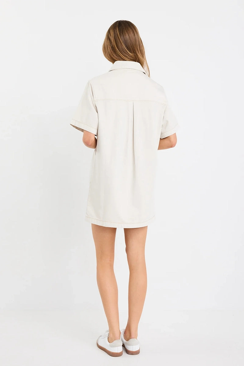The Shortcut Ecru Shirt Dress offers effortless utility style with a modern twist. Cut from 100% cotton denim, this mini shirt dress is designed with a relaxed boxy fit, structured seams, and a clean ecru finish. With its short sleeves and button-front closure, it balances casual comfort with contemporary edge, making it a versatile piece for everyday wear.