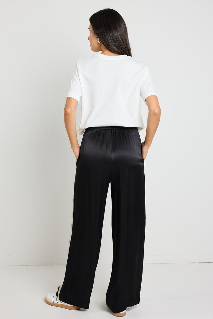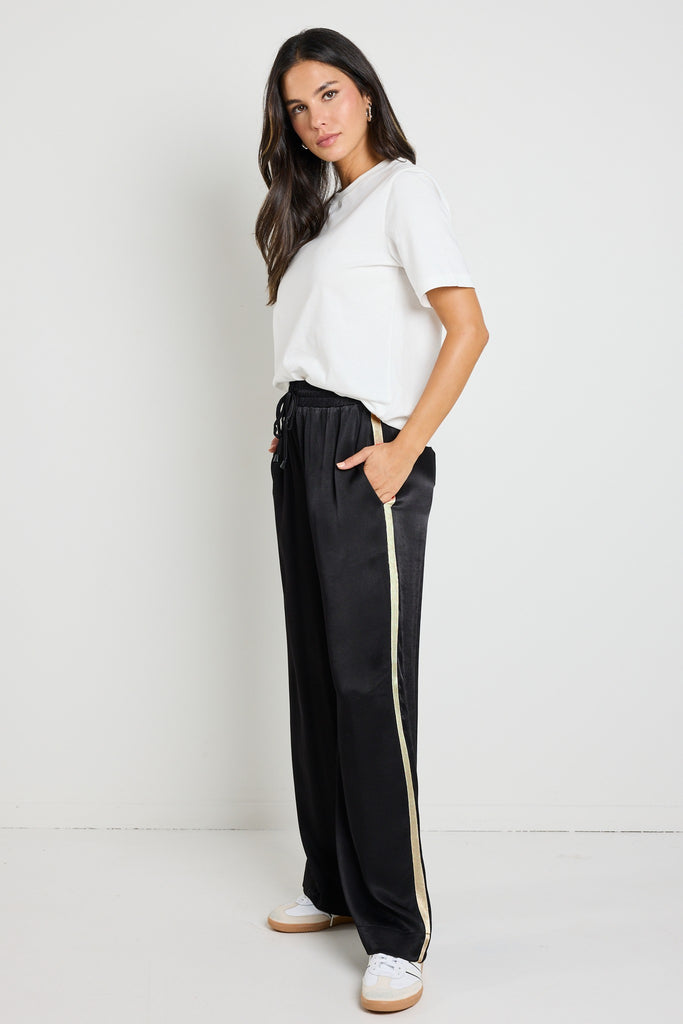 Upgrade your off-duty style with the Townie Black Satin Side Stripe Pants. Designed for ultimate comfort, these relaxed-fit pants feature a silky satin finish, an elasticated drawstring waist, and contrast white side stripes for a chic, athleisure-inspired look. Whether you're styling them with sneakers and a basic tee for casual days or dressing them up with heels and a blazer, these versatile pants bring effortless cool to any outfit.