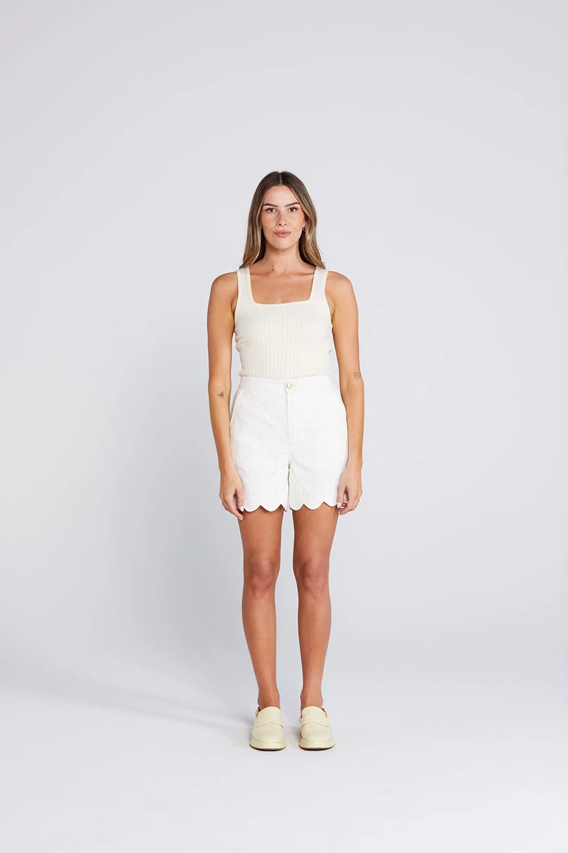 we promise you'll want to wear these every day. The Everyday Short features antique brass rivets and tacks, a scalloped hem, pockets and a zip fly, with a dash of elastic in the back for added comfort.