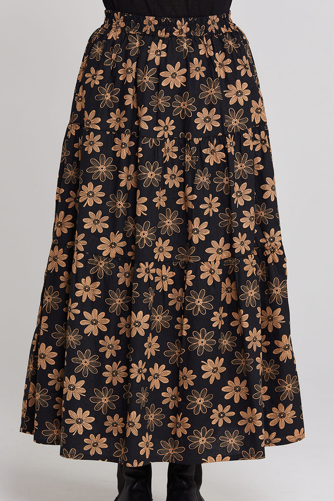A tiered skirt with a comfortable elastic waist, and a sneaky inside cotton lining to hide your cute wee knicks, and add an extra layer of warmth to your leggies.